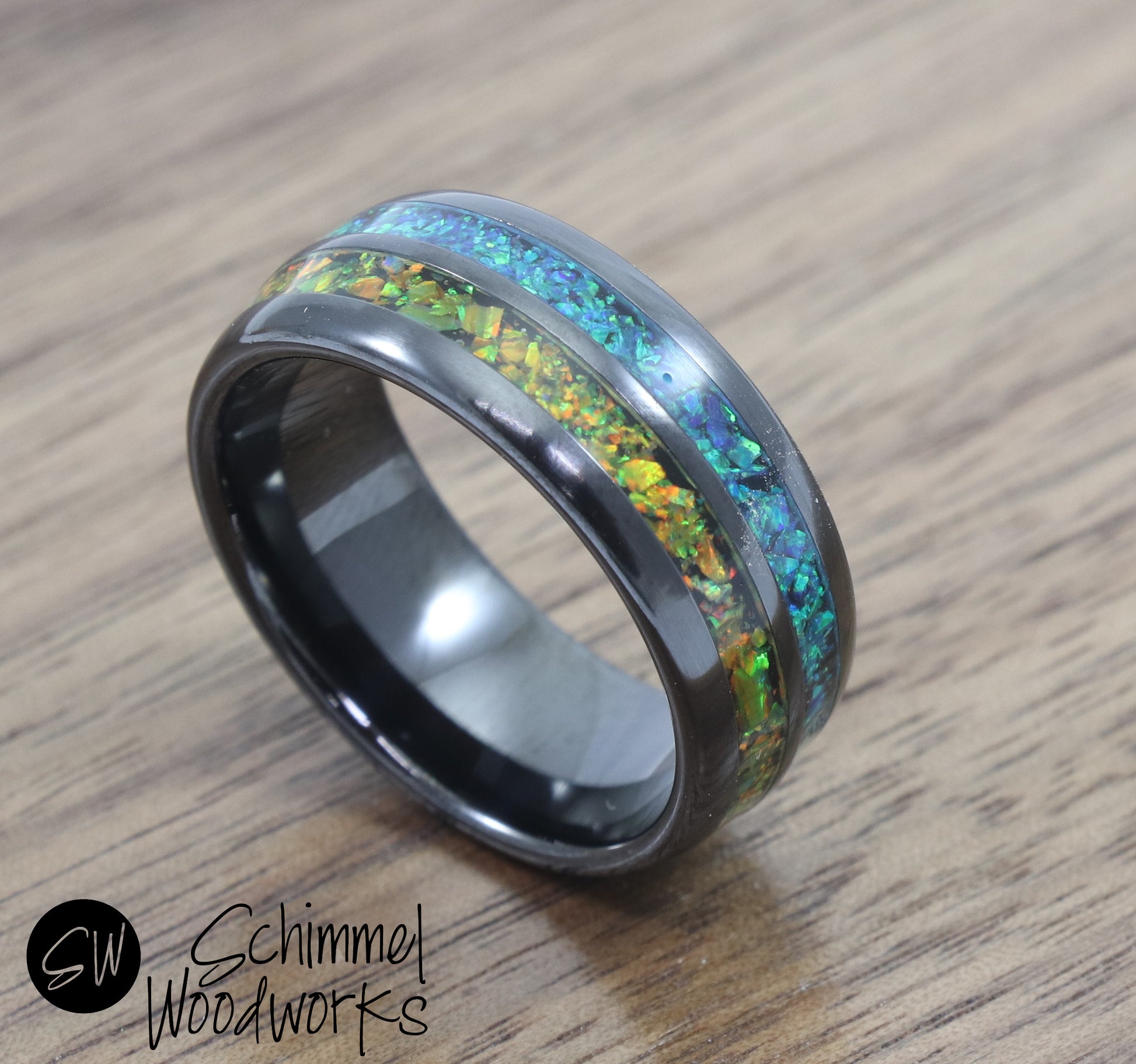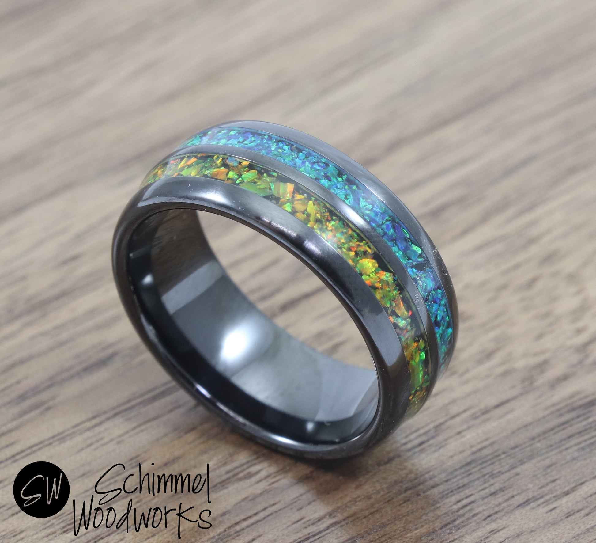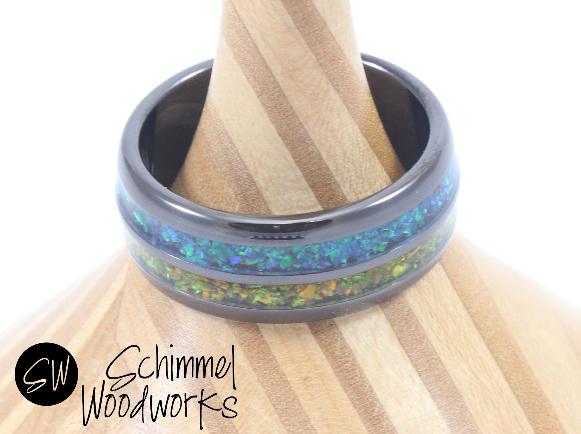 Black Ceramic double channel ring with opal in crystal clear resin.