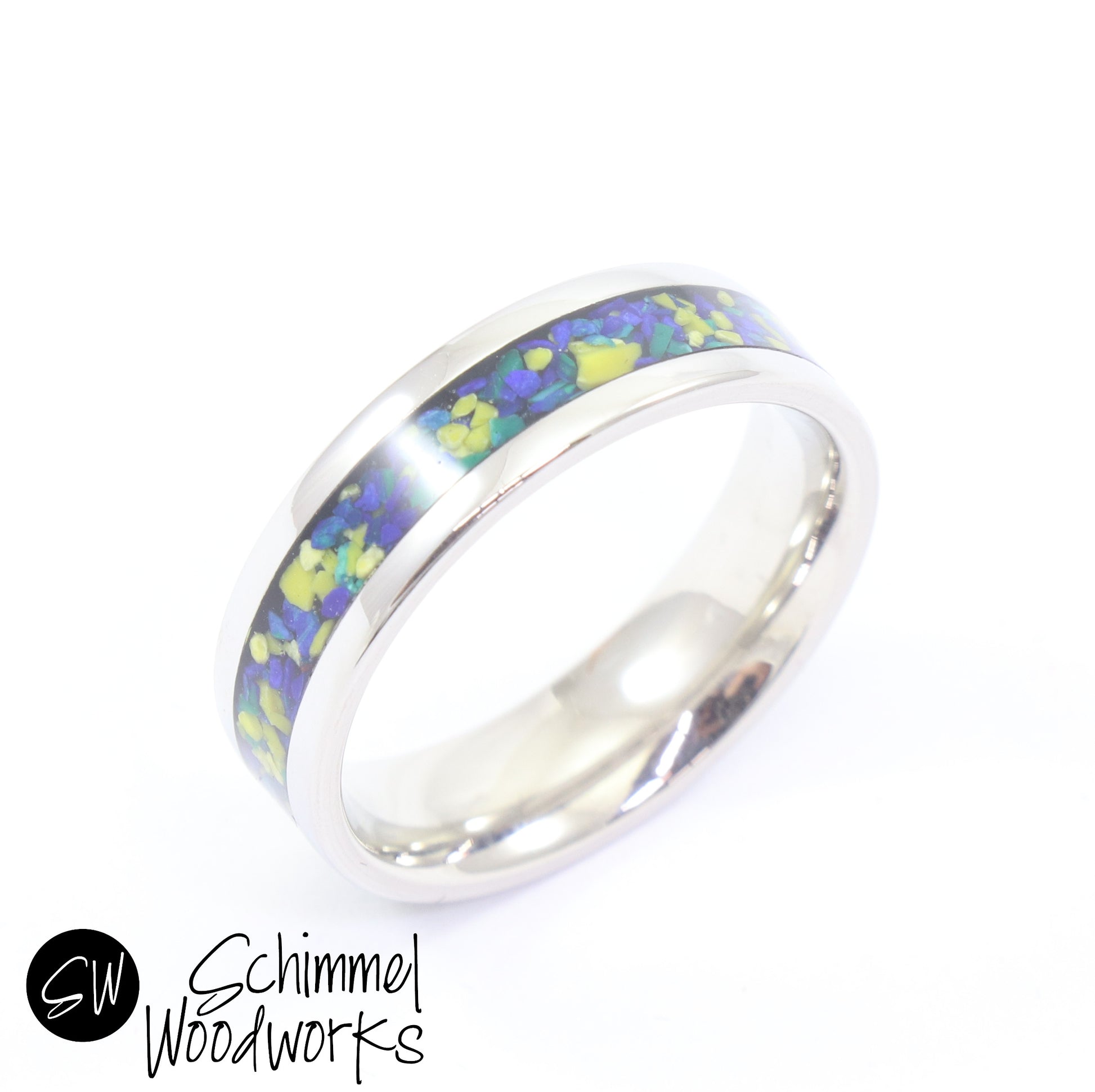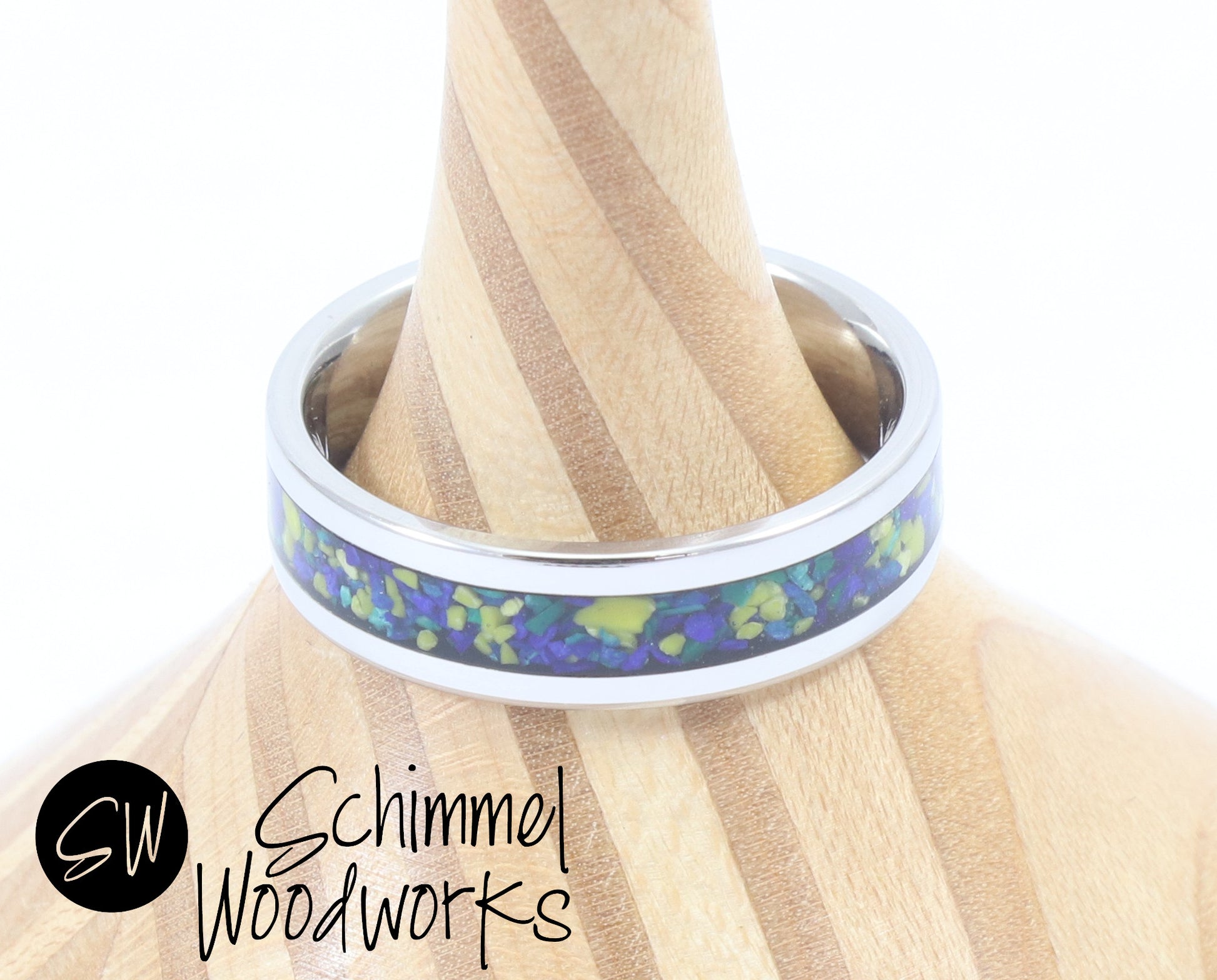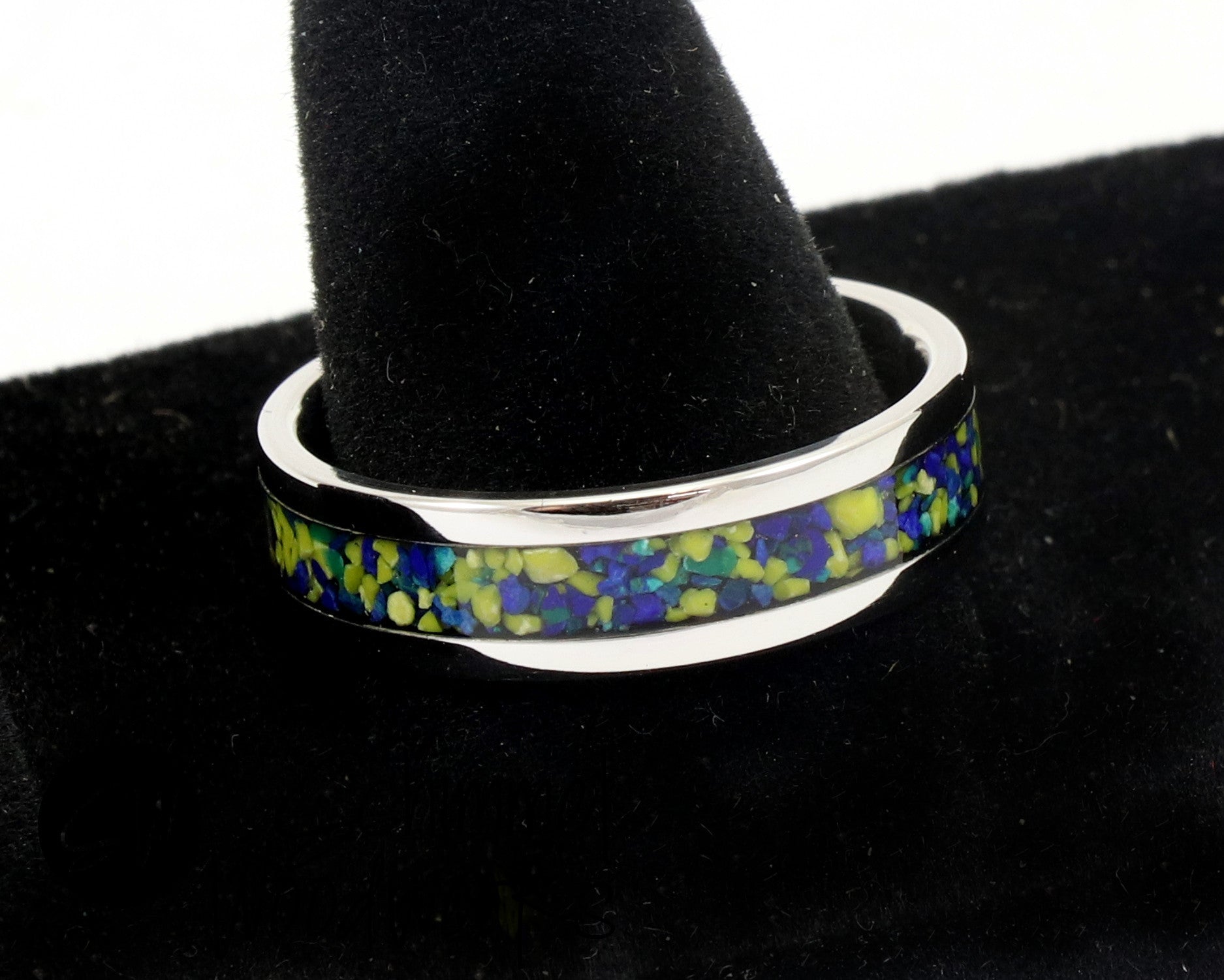 Made with lab created stone inlay in a Stainless Steel Ring.