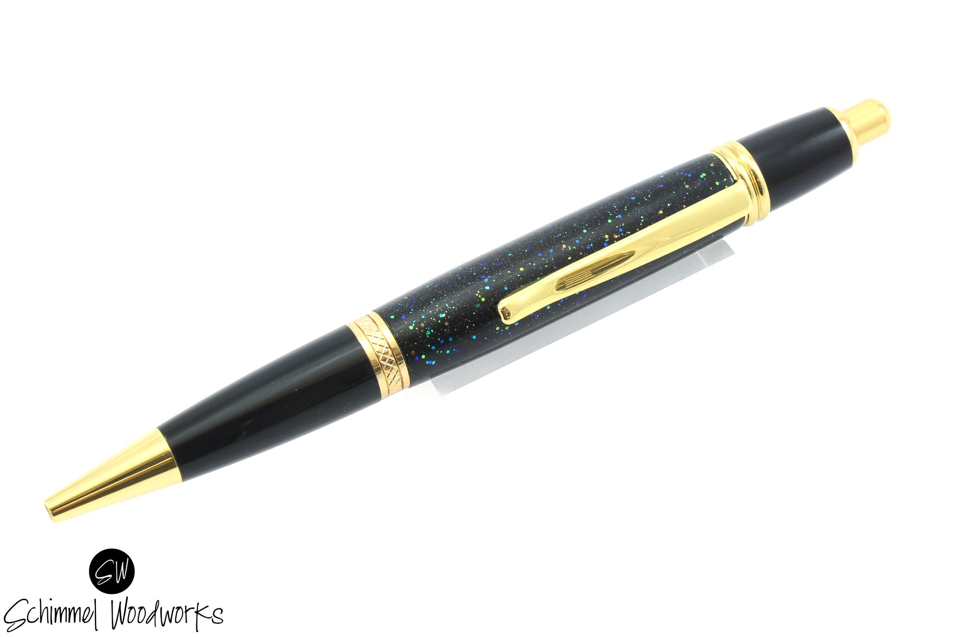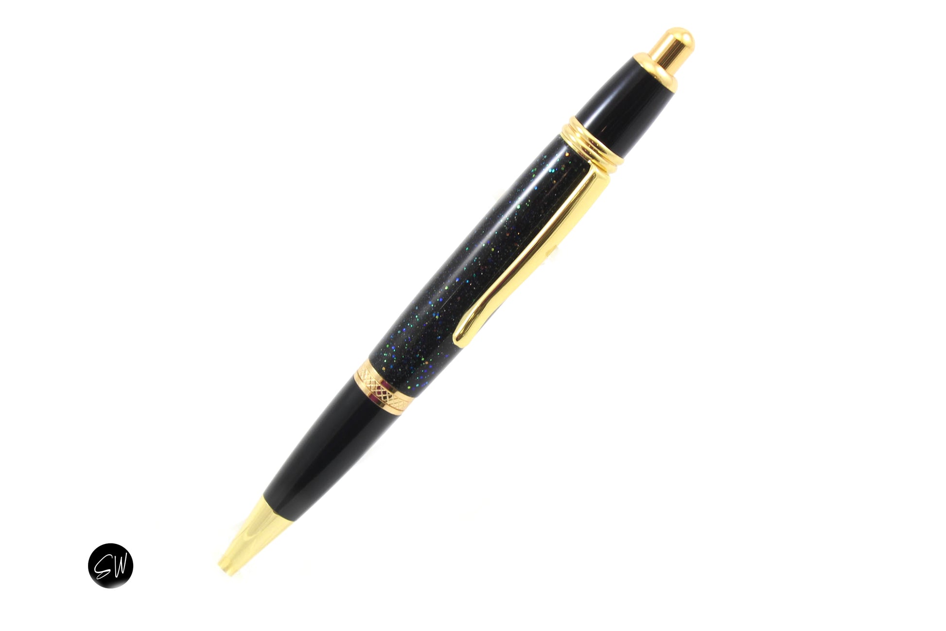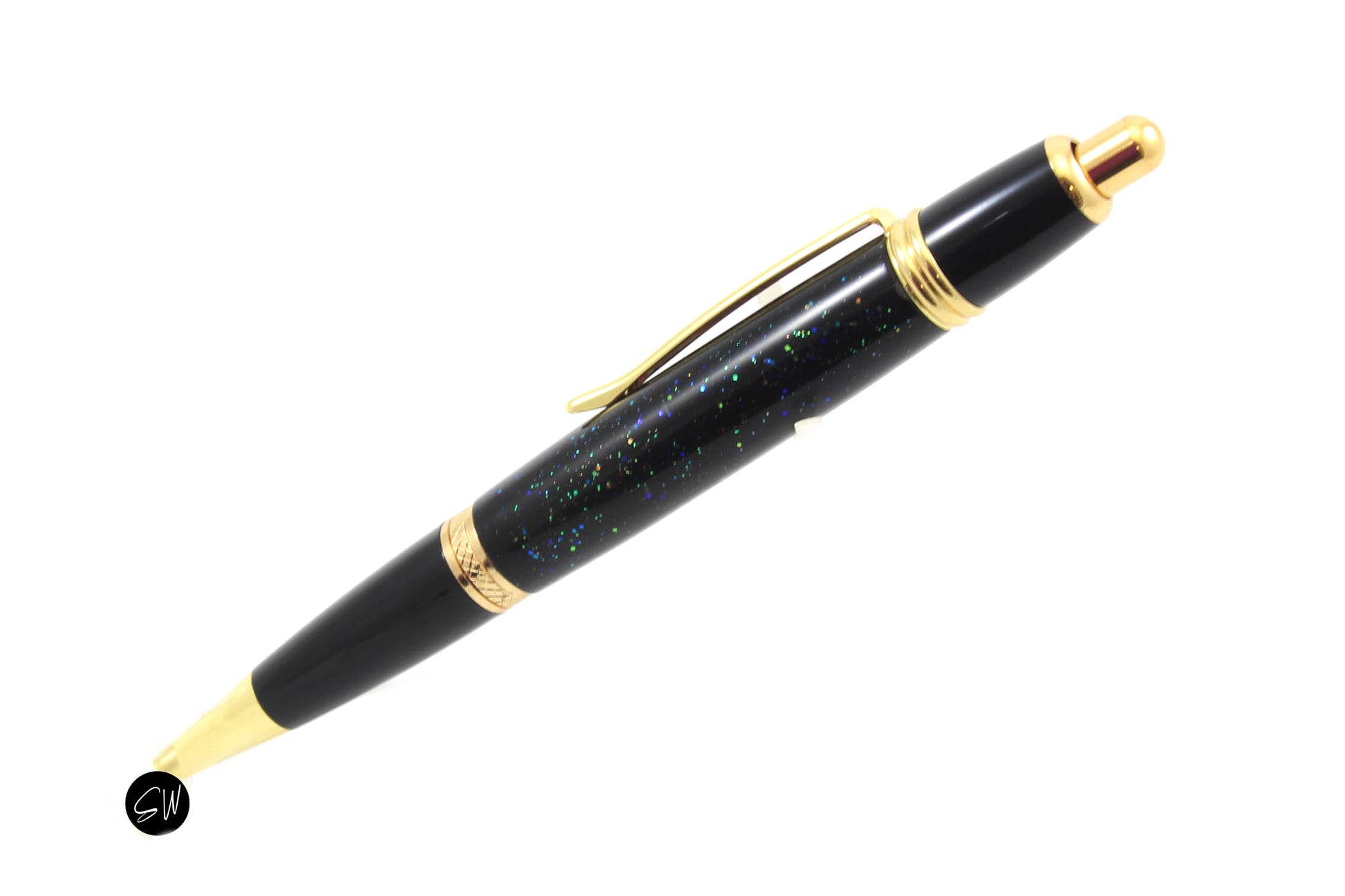 This is a ballpoint pen featuring a body made with Blue & Green Glittery body paired with Gold and Black metal accents. This click pen has amazing details on the body, one of a kind! It comes in a gift box.
