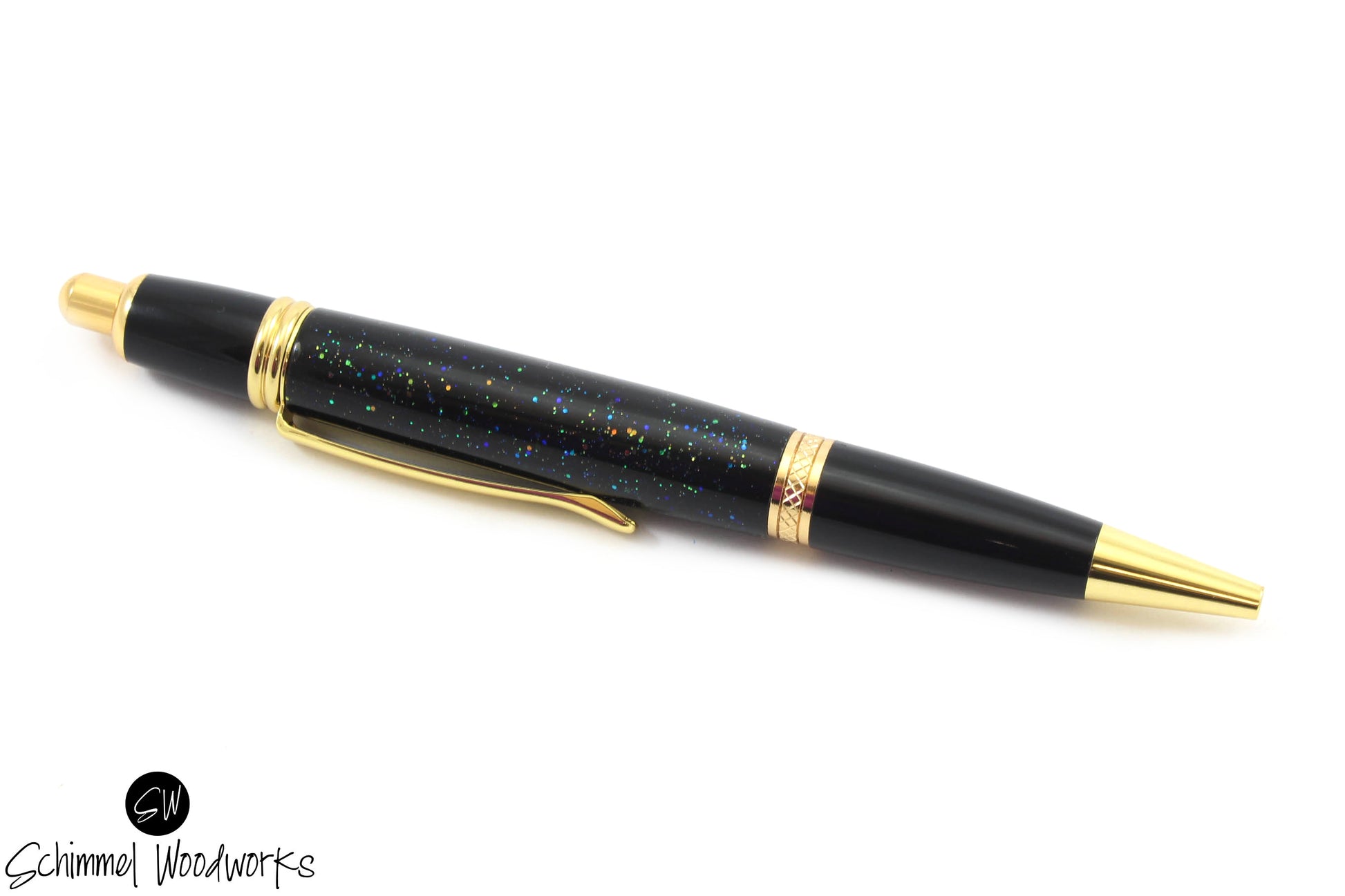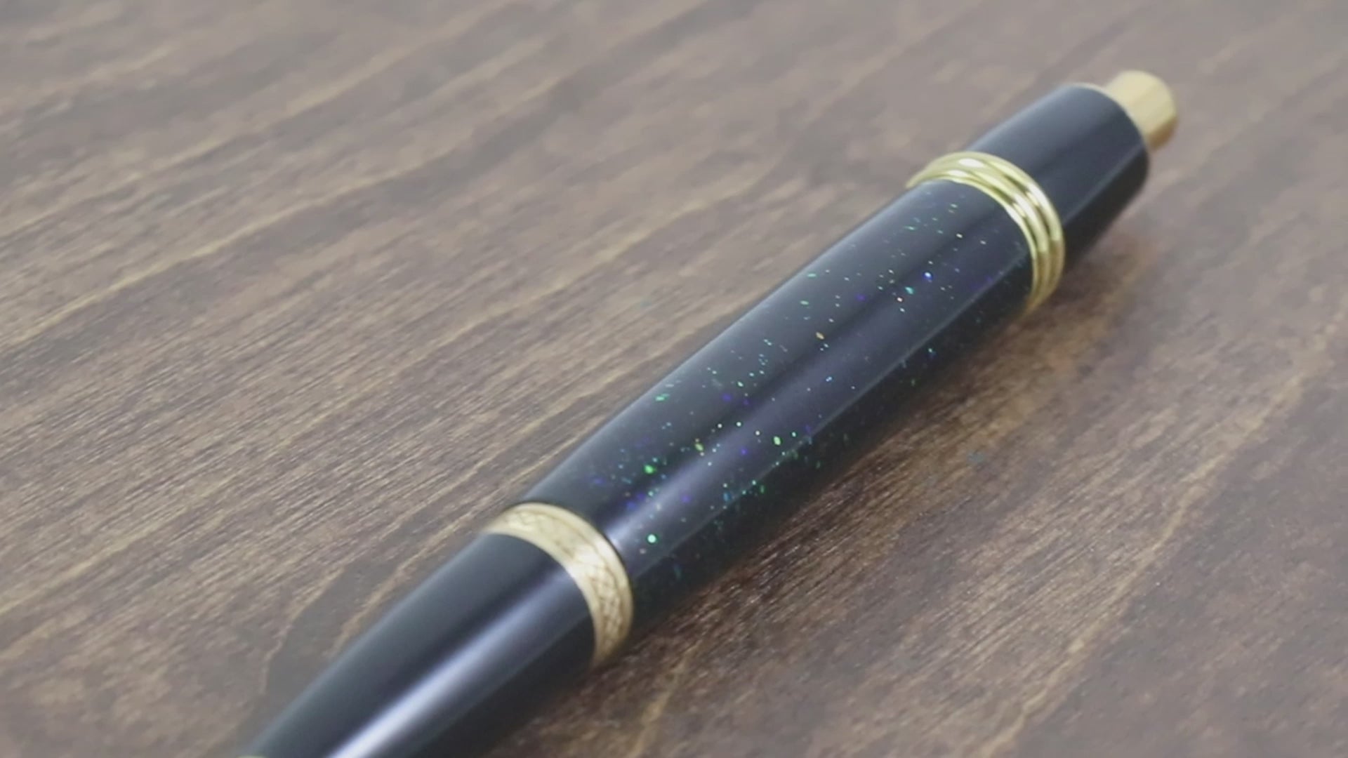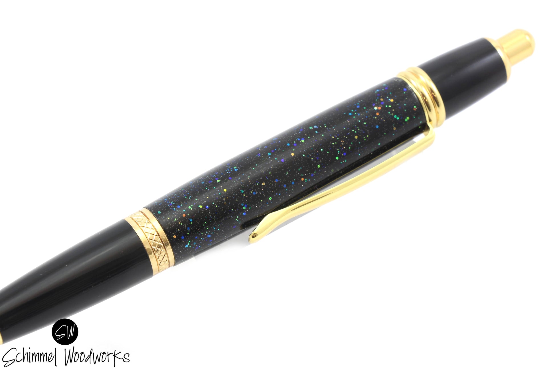 This is a ballpoint pen featuring a body made with Blue & Green Glittery body paired with Gold and Black metal accents. This click pen has amazing details on the body, one of a kind! It comes in a gift box.