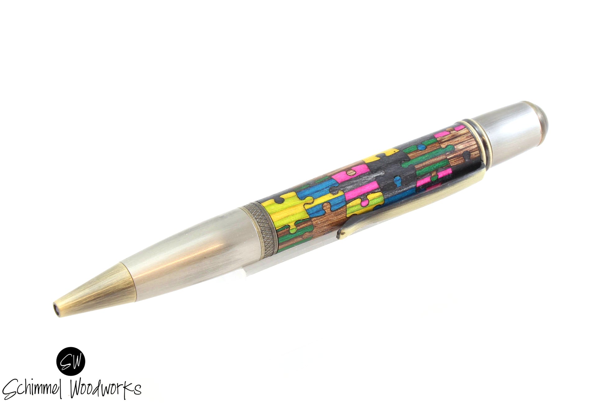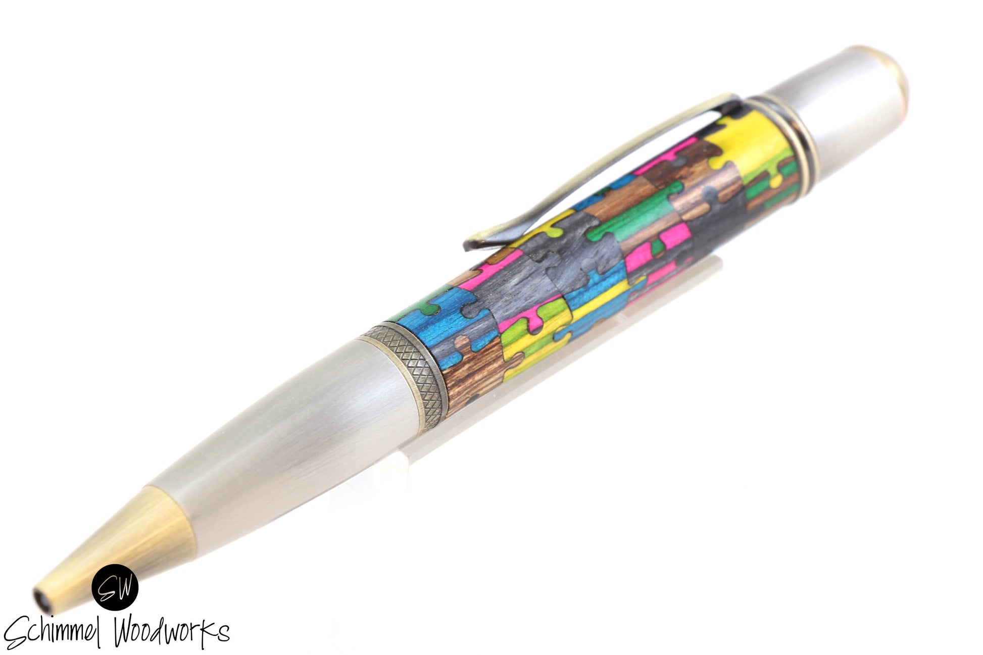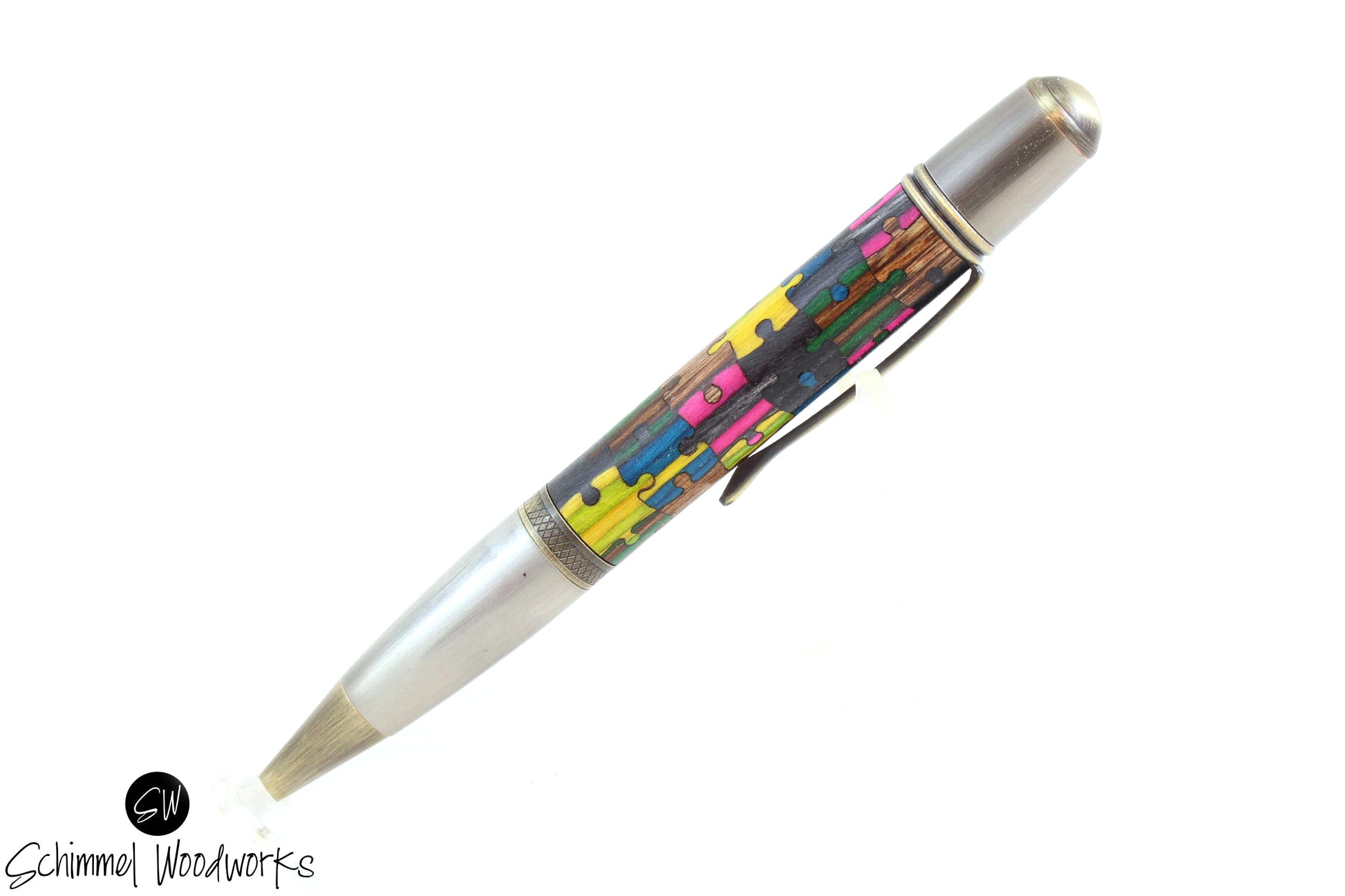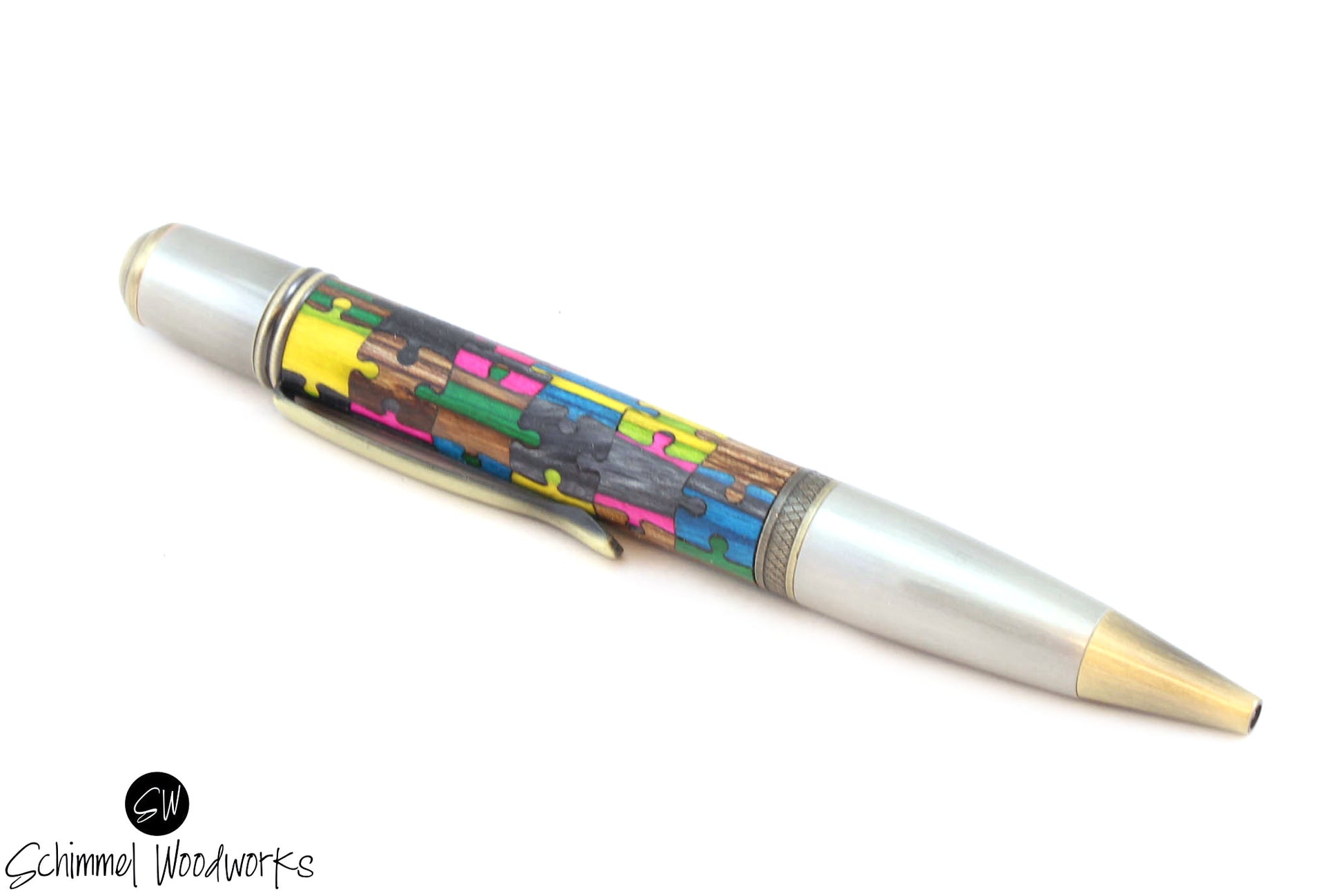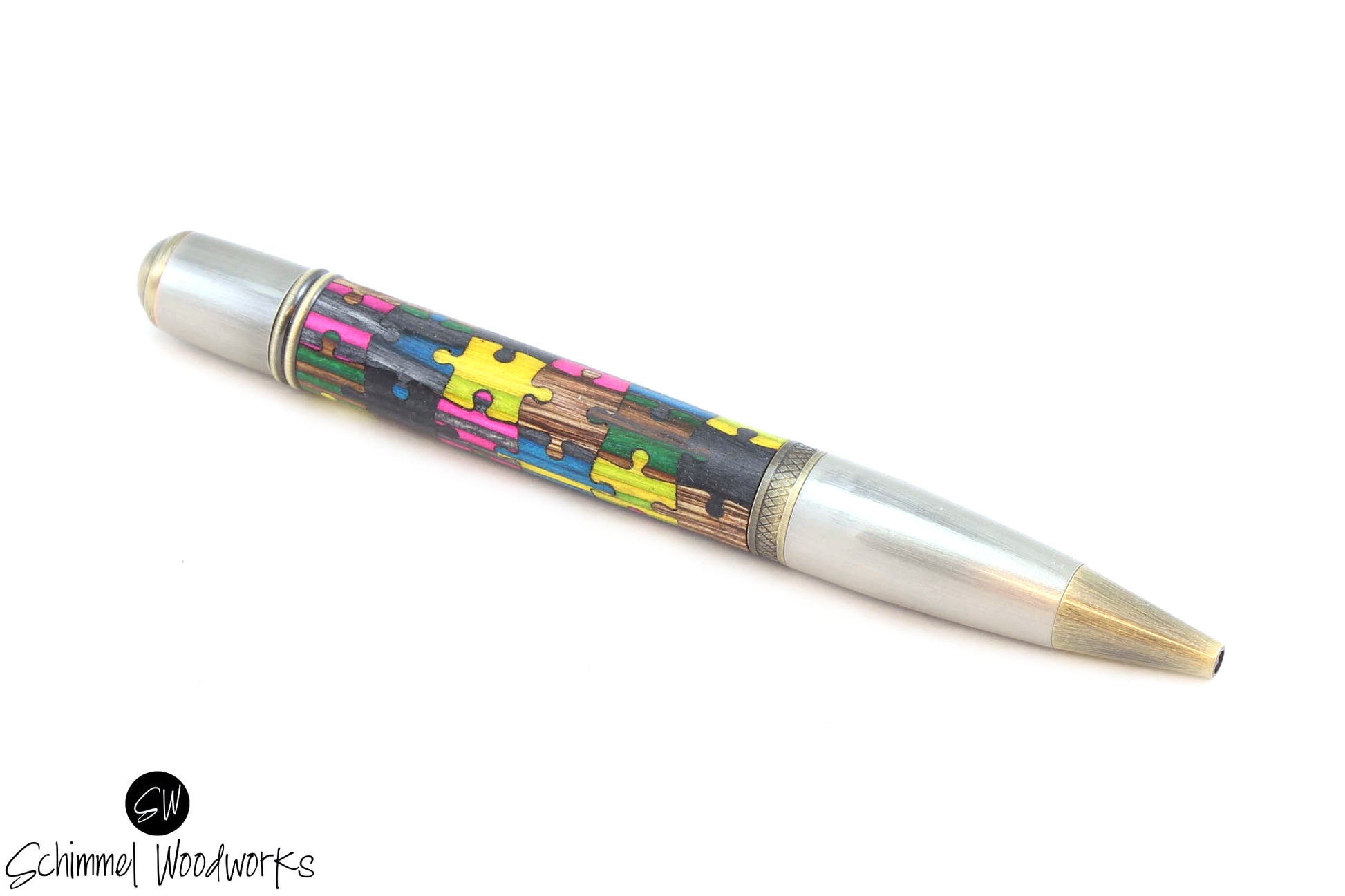 This is a pen featuring a body made with carefully pieced together puzzle shaped wood of all different types and colors. The bright, bold colors of the dyed wood gives this pen a unique and fun aesthetic that can brighten up your day!