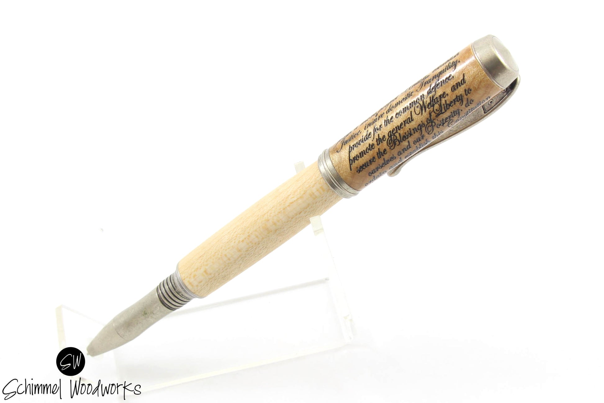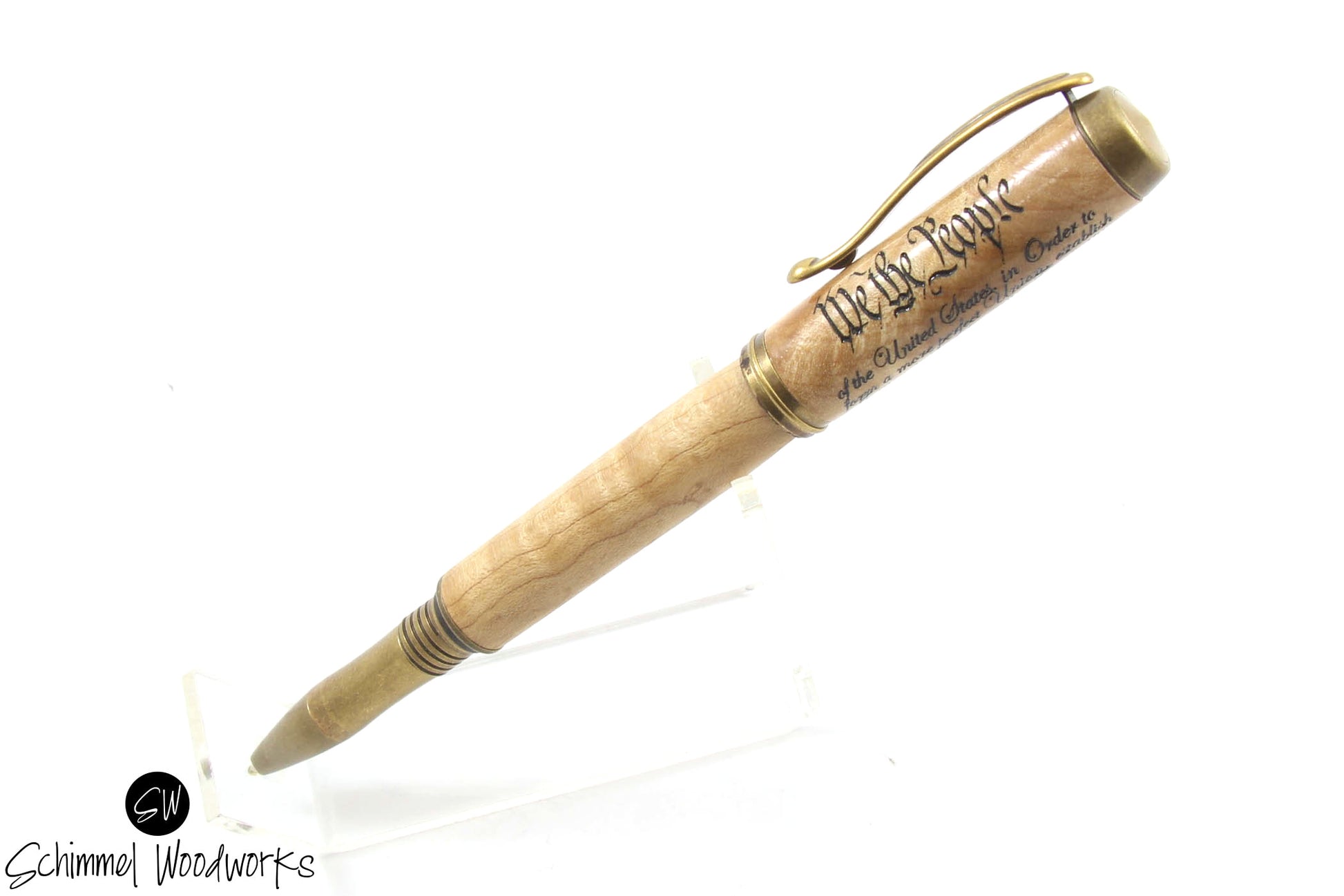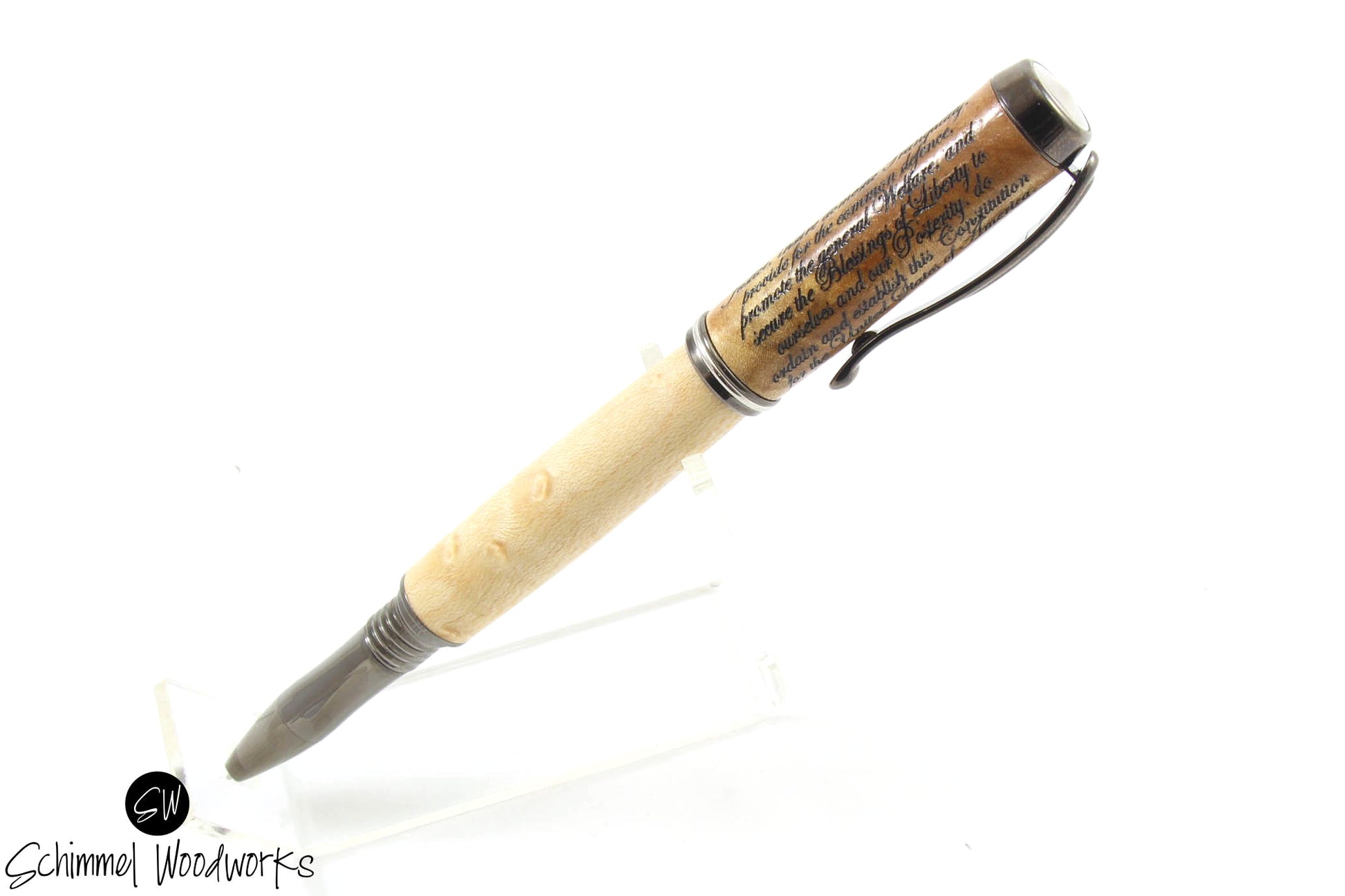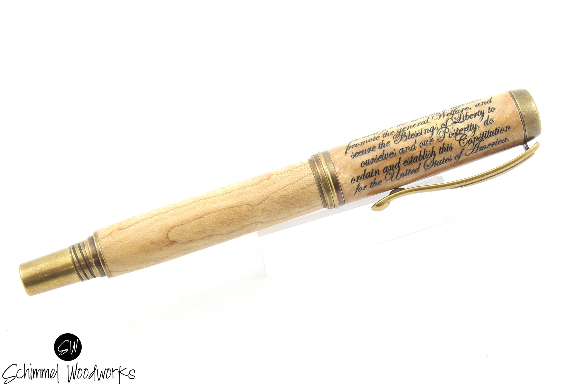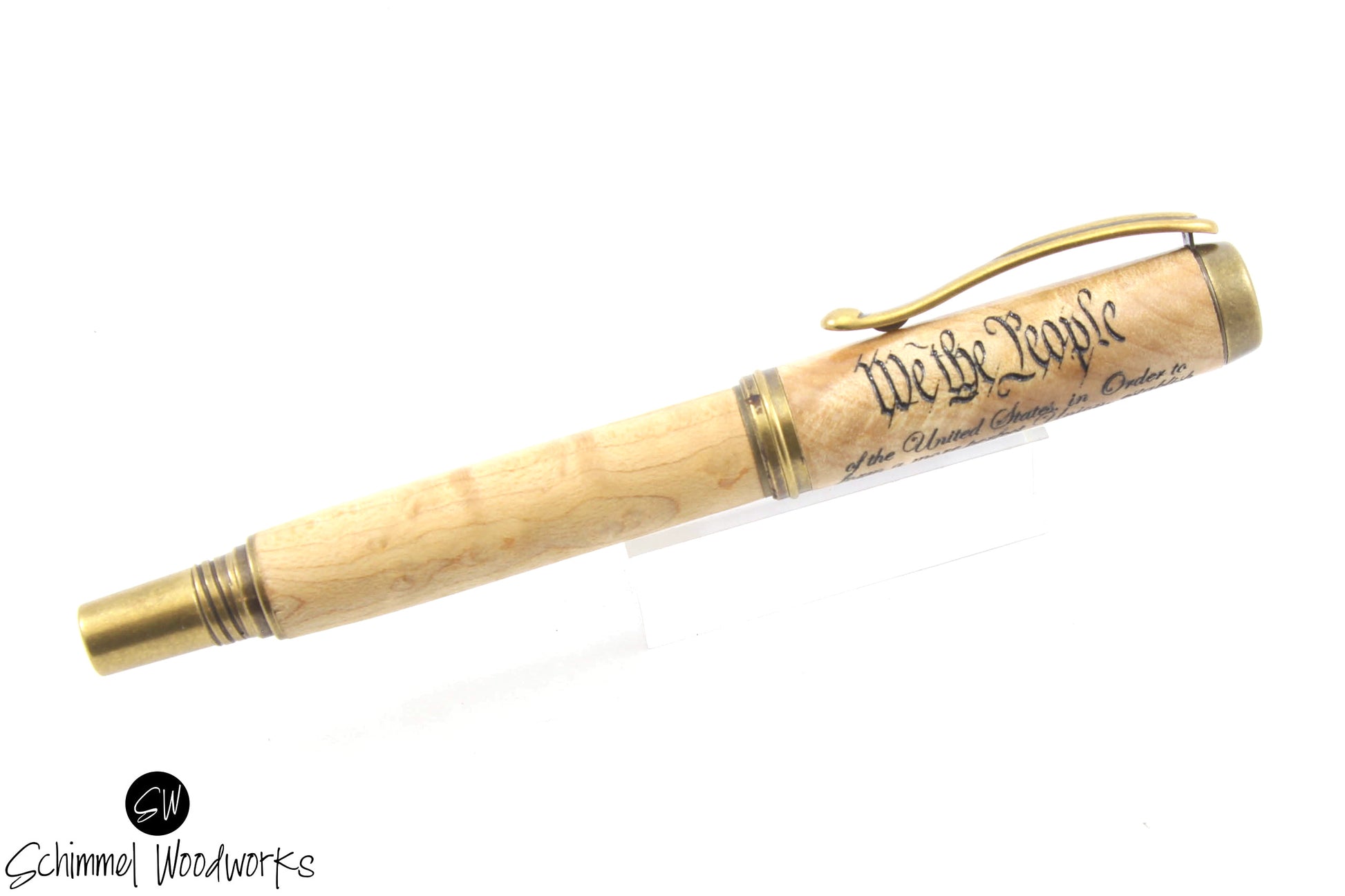 This Rollerball pen features a handmade "We the People" Constitution engraved into a beautiful Maple wood body . Your choice of Antique Silver, Antique Brass or Black Titanium finish