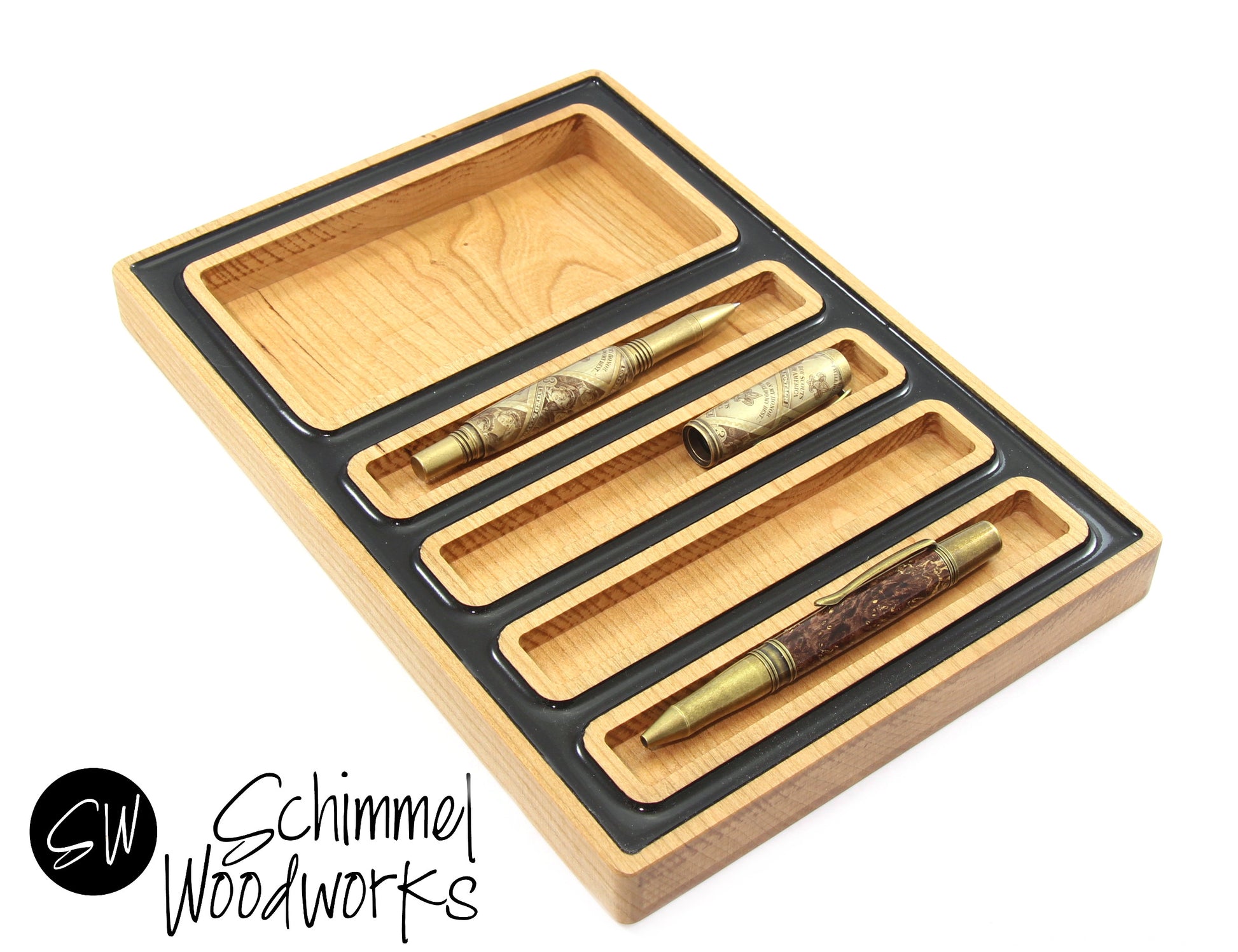 Pen Tray and Desk Organizer - Maple Wood with Black Pearl Acrylic Outline - Fits 4 pens & accessories - One of a kind gift