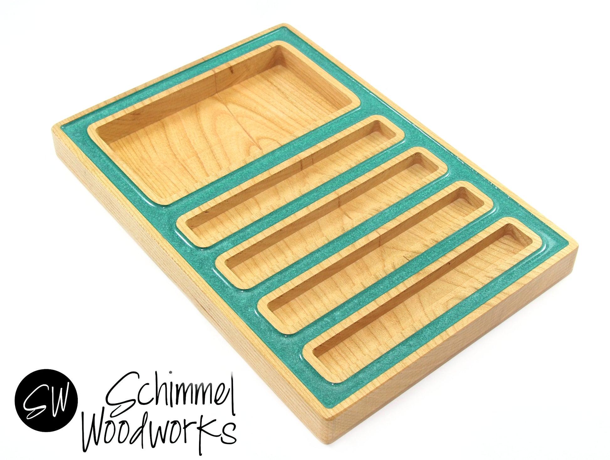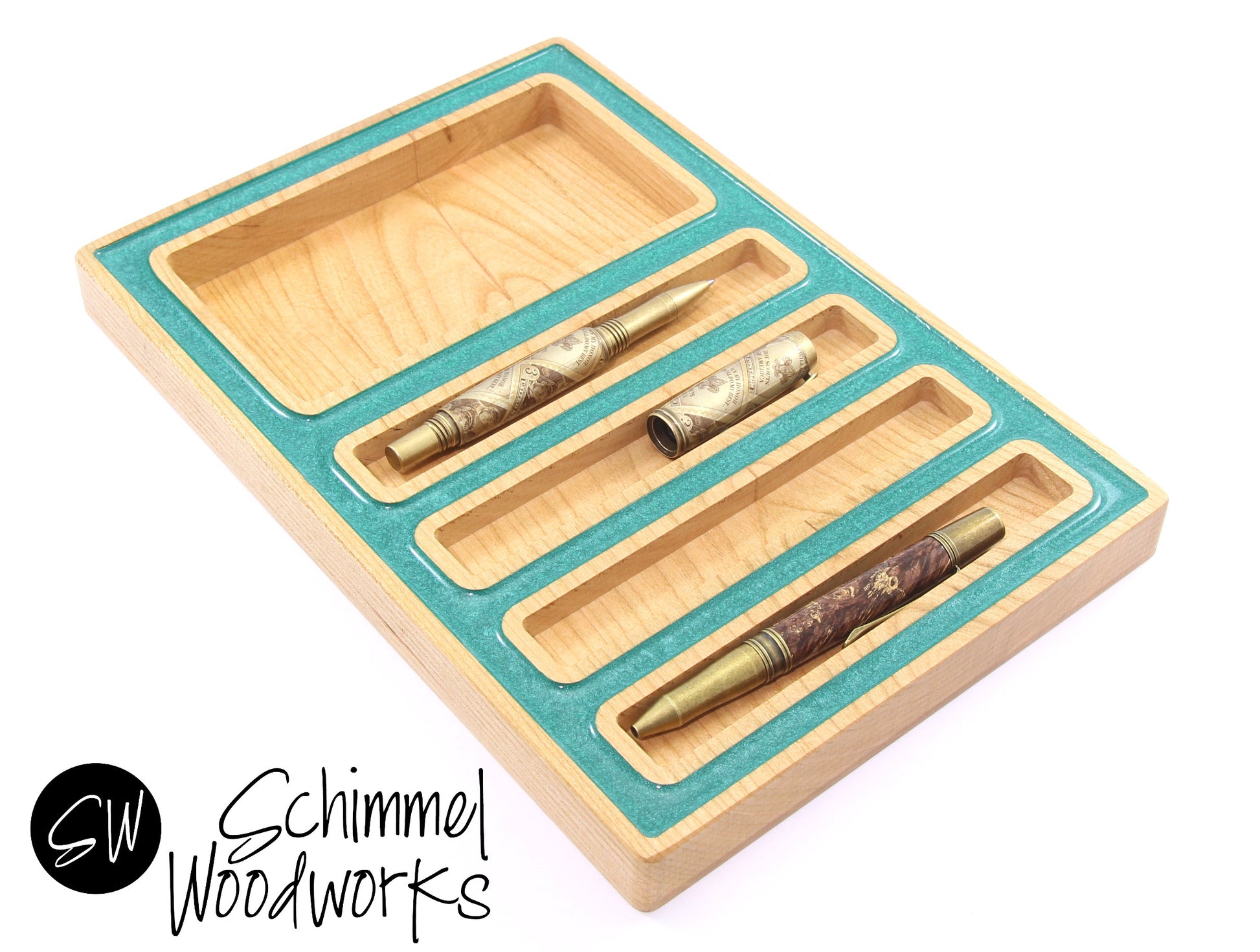 Pen Tray and Desk Organizer - Maple Wood with Teal Pearl Acrylic Outline - Fits 4 pens & accessories - One of a kind gift