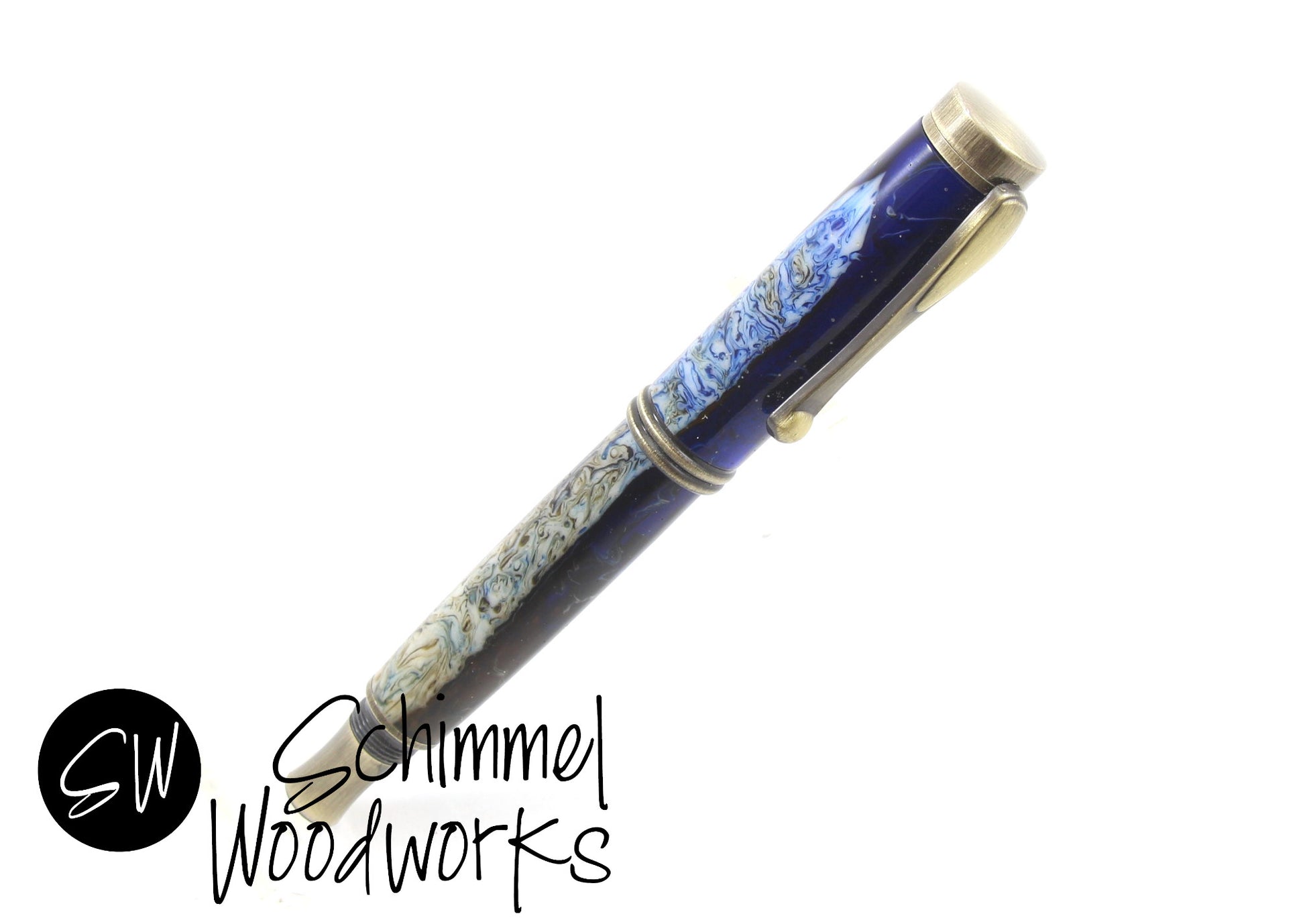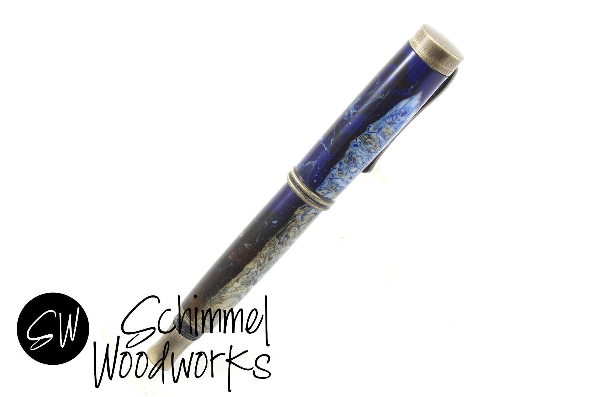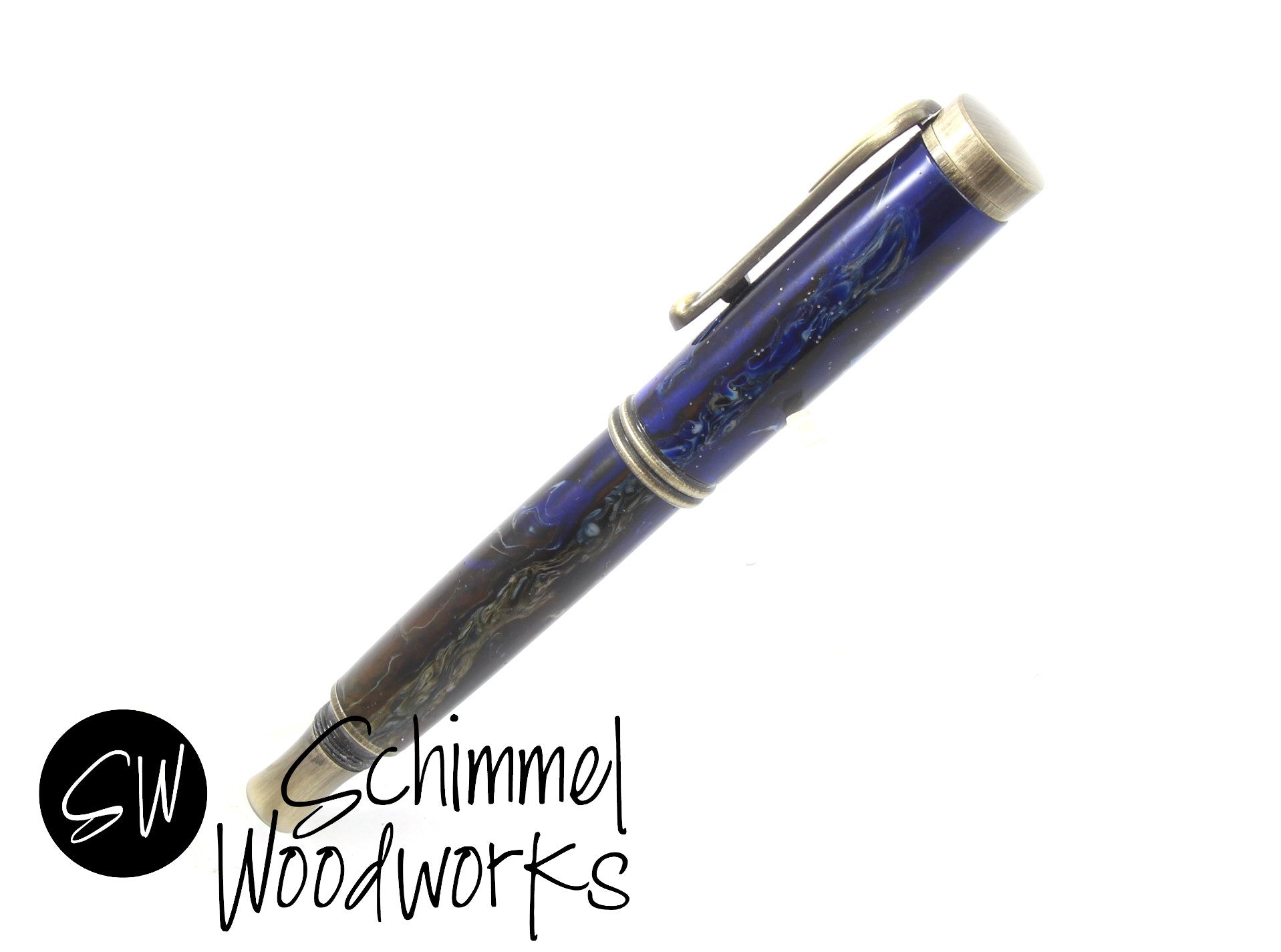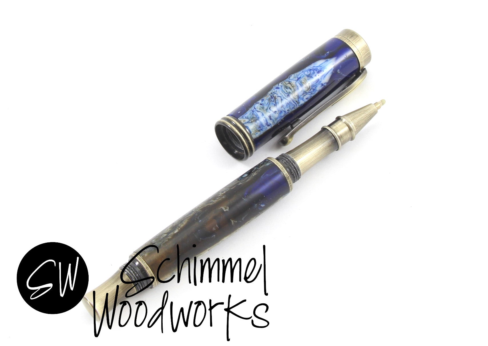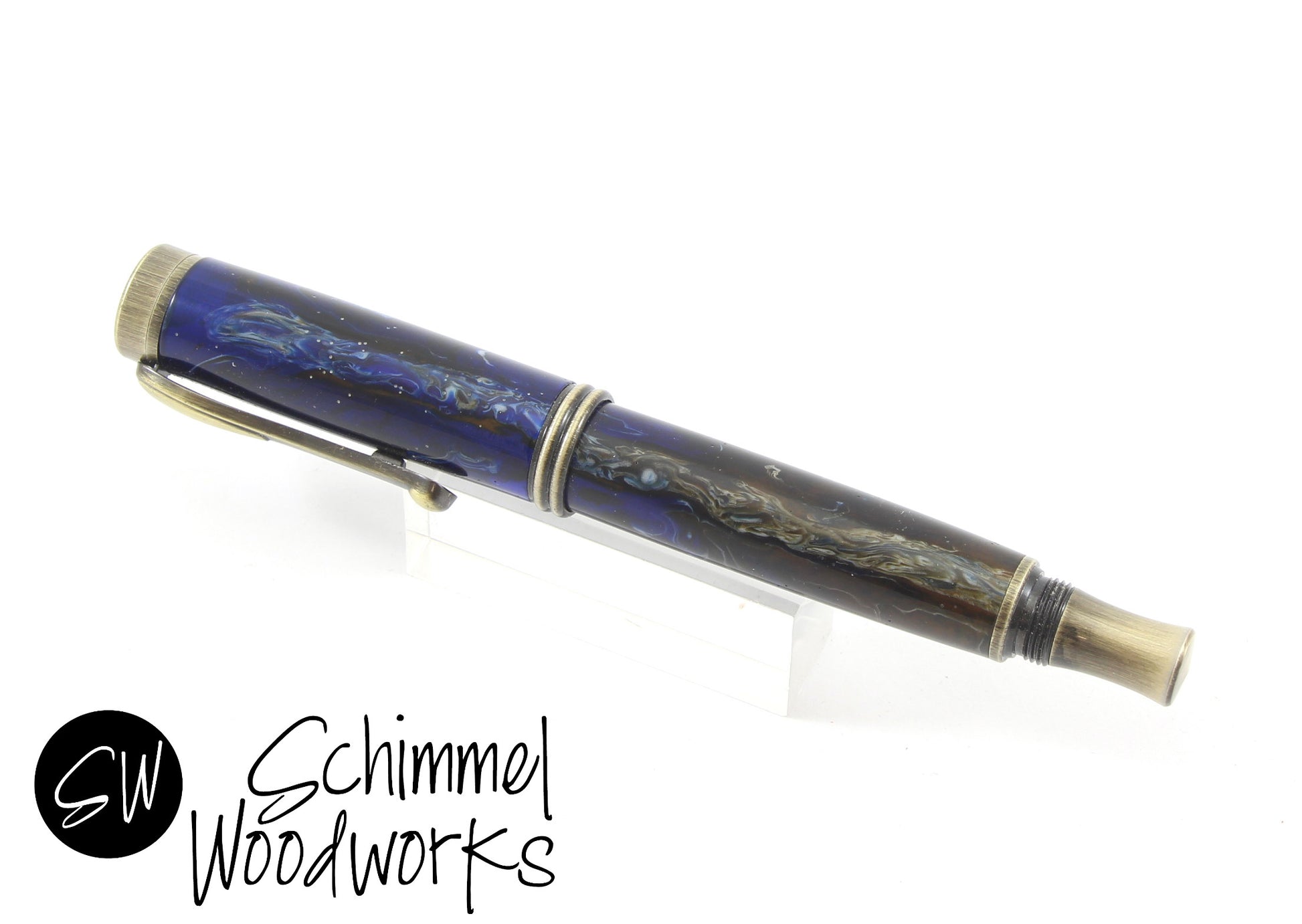 This pen features Antique Brass paired with rich blue and brown swirl.