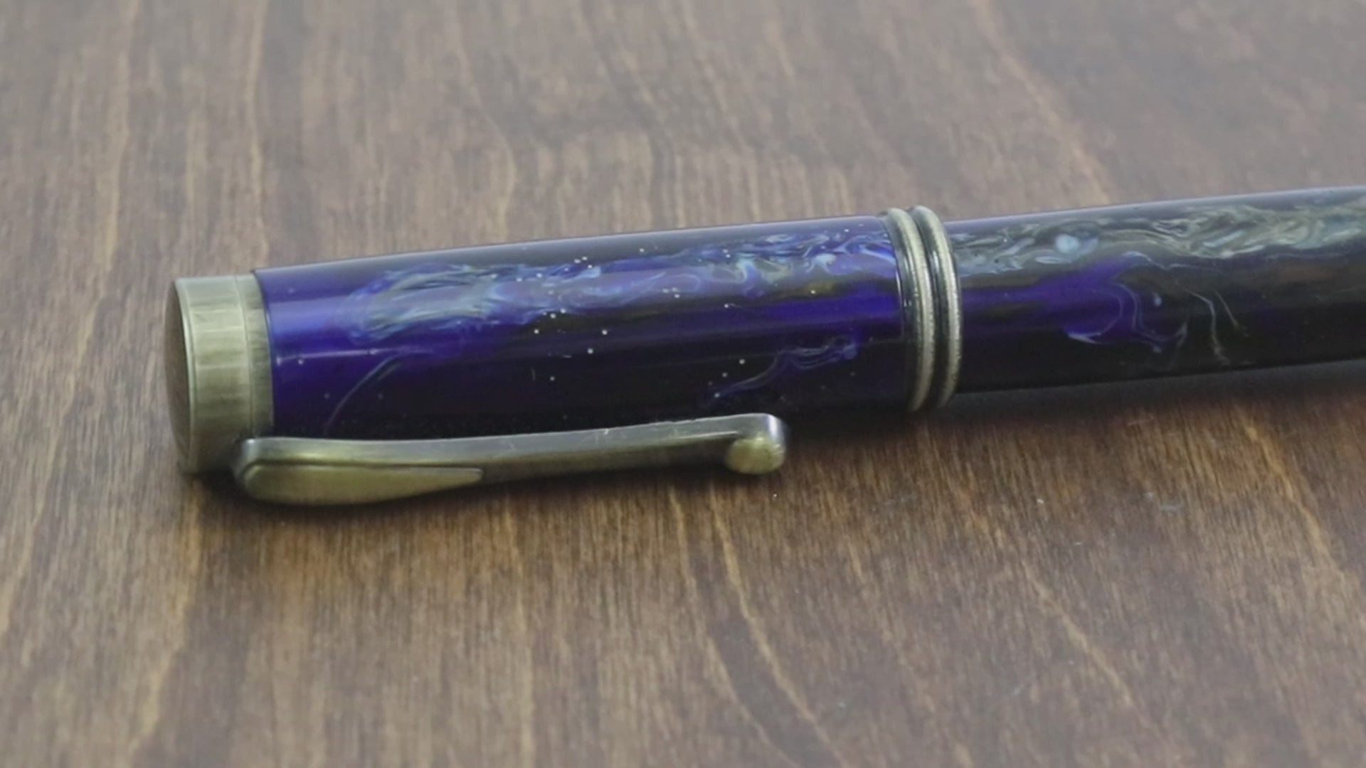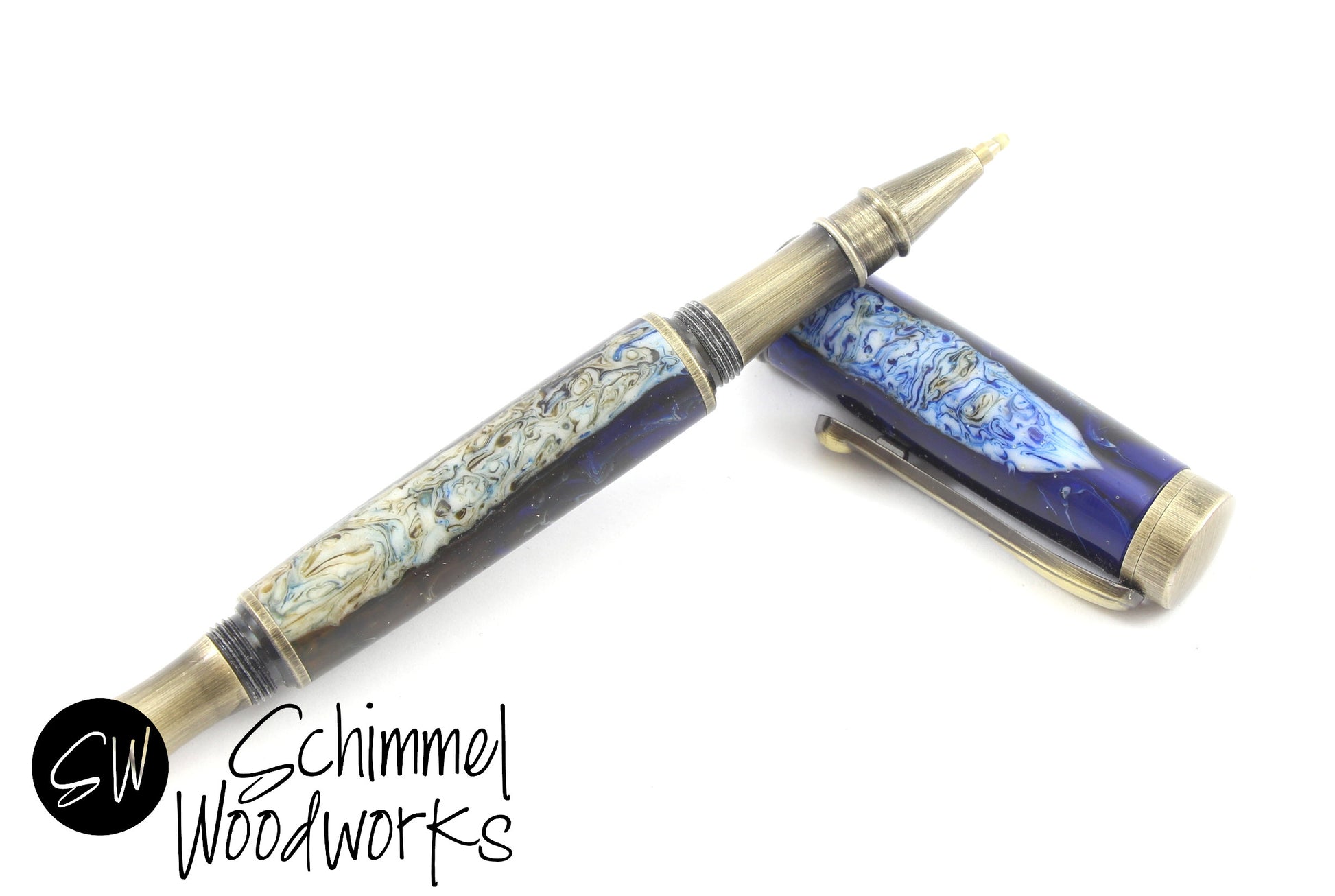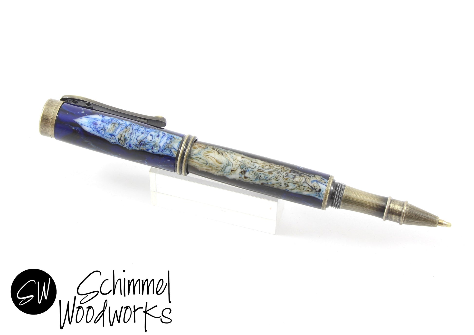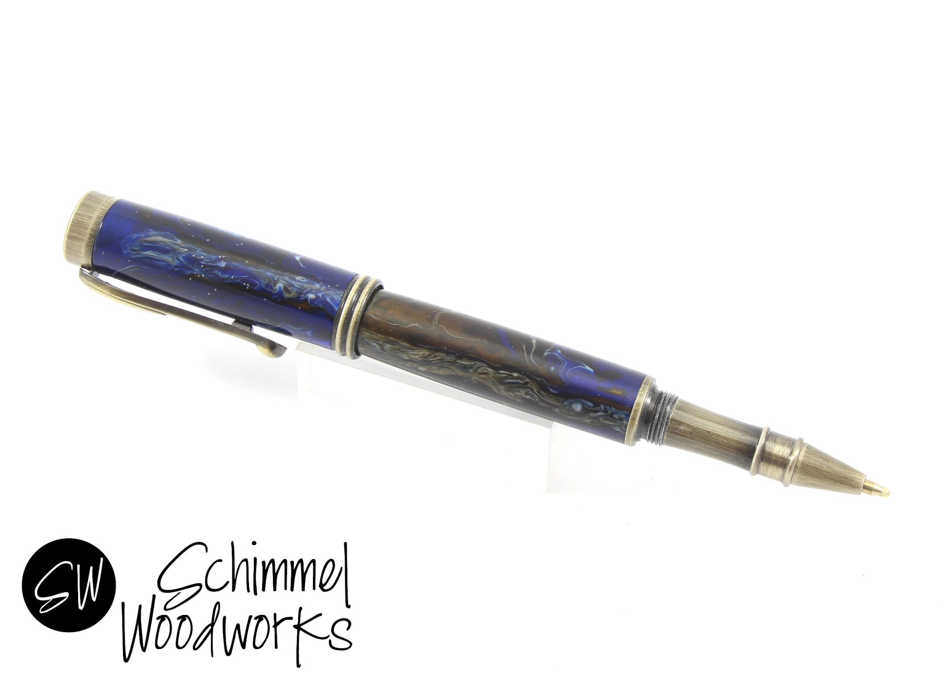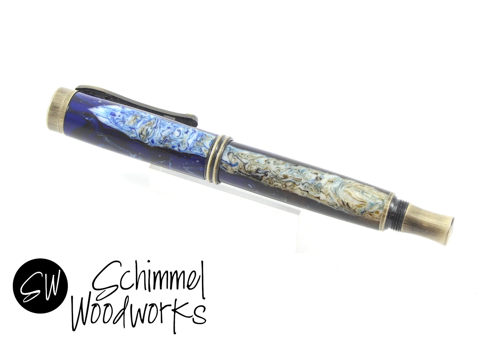This pen features Antique Brass paired with rich blue and brown swirl.