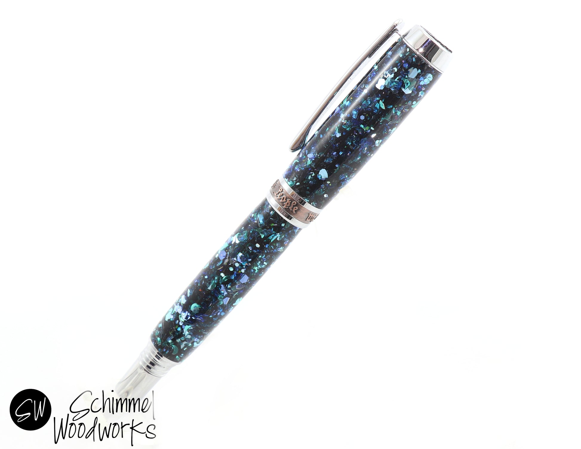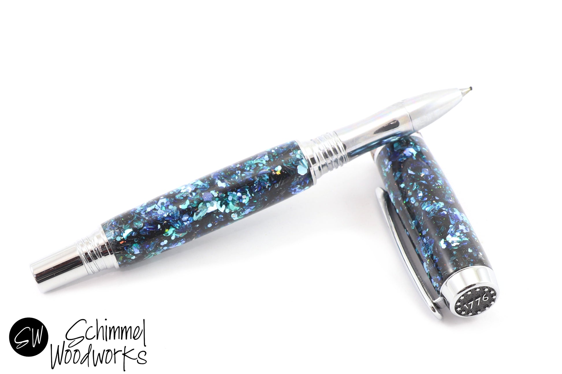 This stunning pen is made from blue confetti glitter in crystal clear resin with Chrome metal accents, We the People center band in copper and 1776 date on cap.