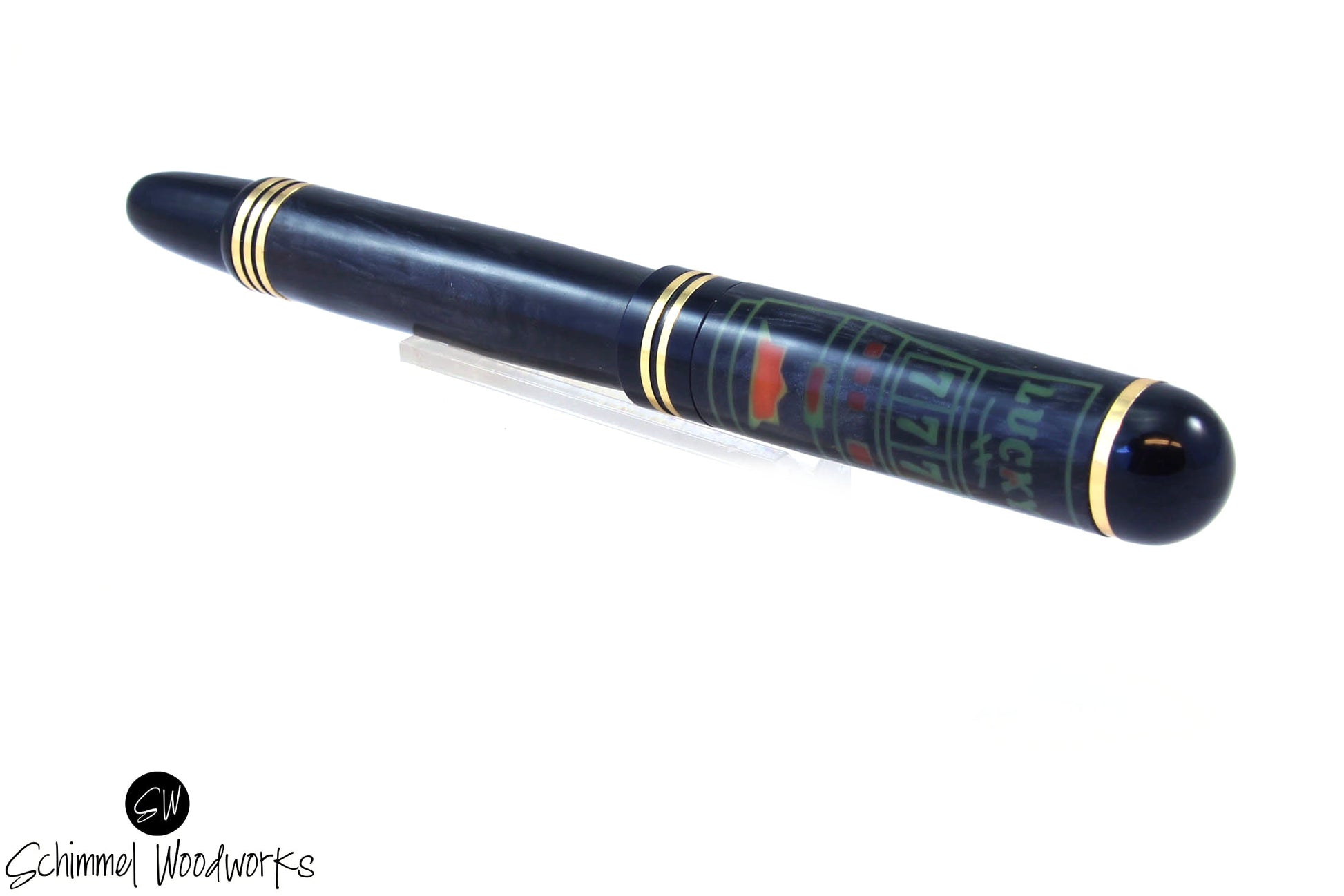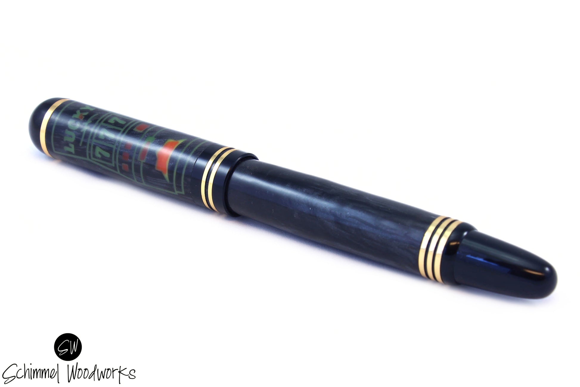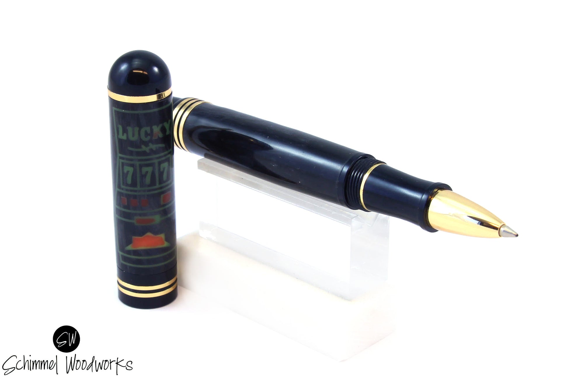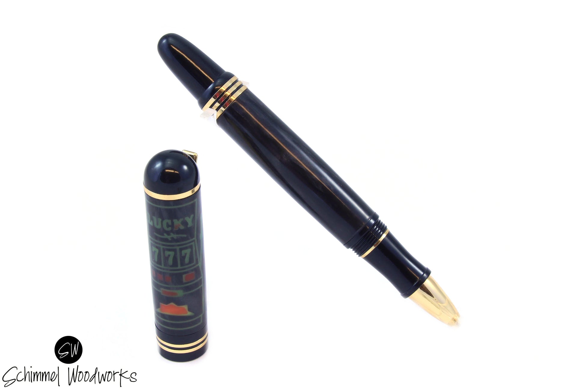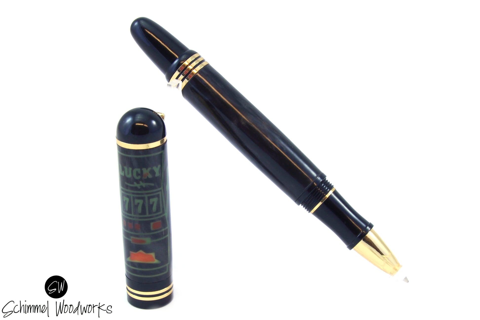 This is a handmade pen features a handmade body featuring black pearl resin with Lucky 777 Slot Machine. Great gift for a gambler, casino enthusiast, Vegas fan, etc.