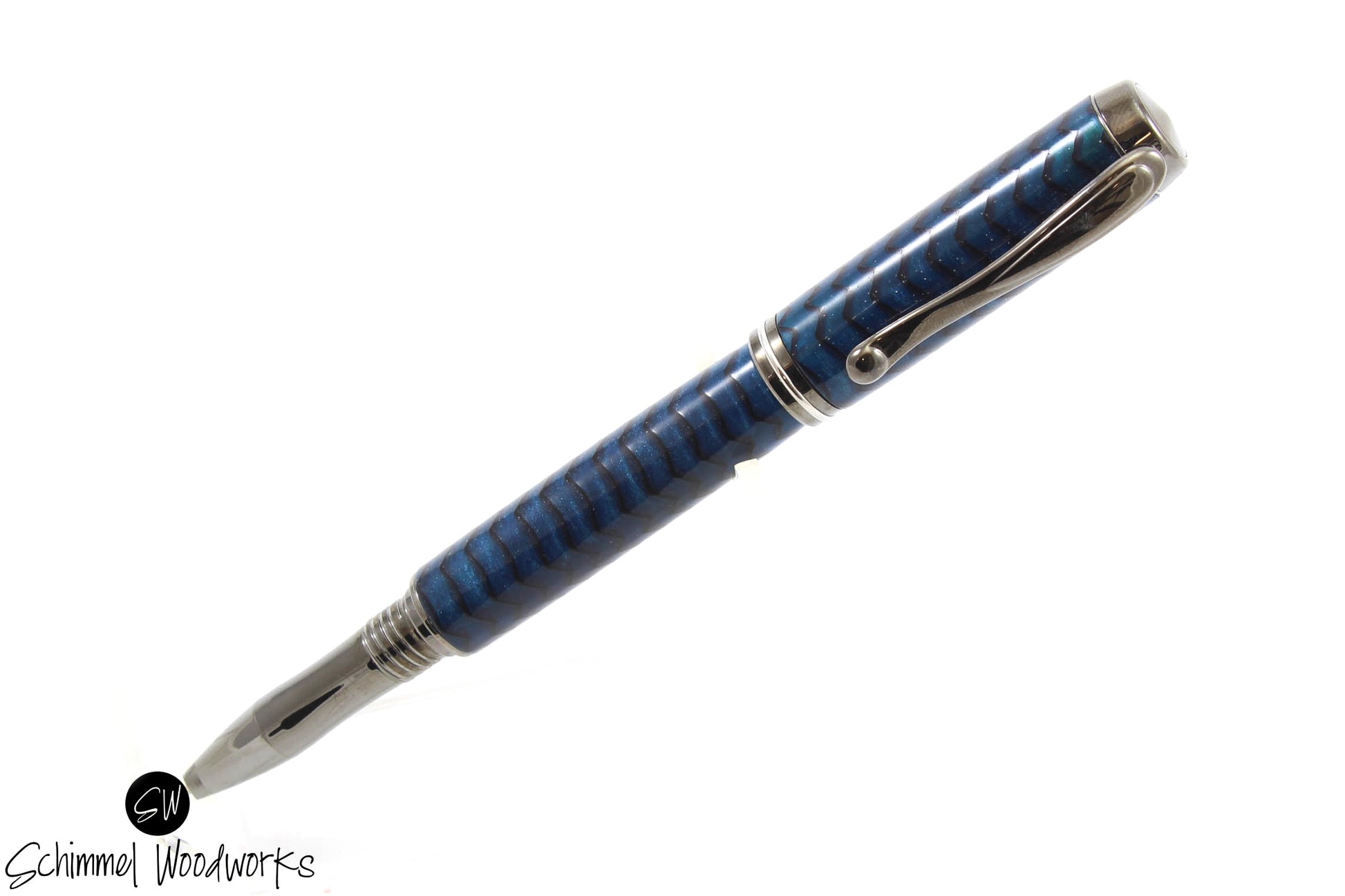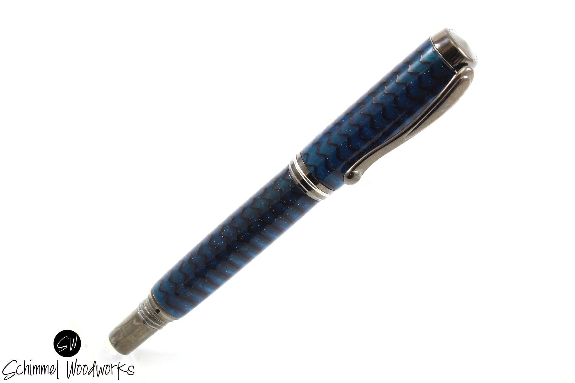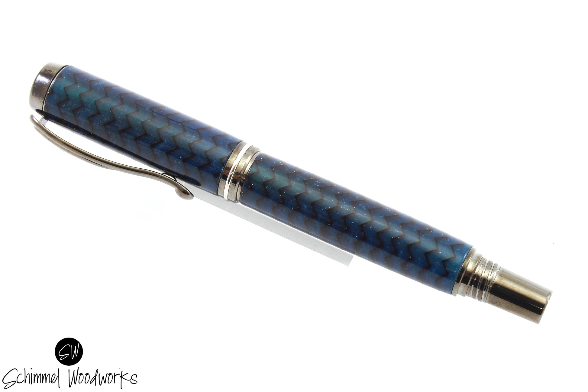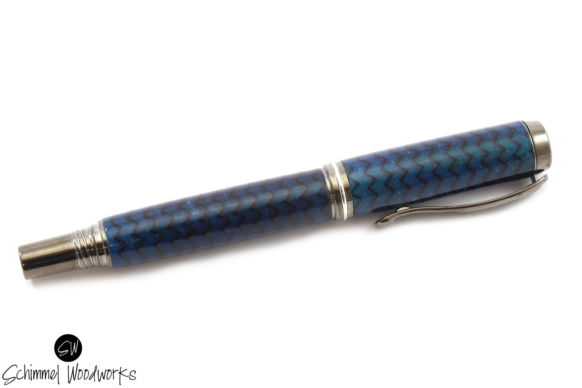 This is a one of a kind pen featuring a body made with 3D printed Chevron pattern dyed with different colored resin. The body has real depth and looks incredible. Cap screws on to back end.
