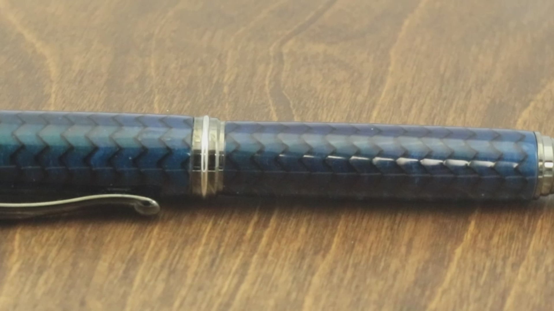 Layers of pearl resin in a cool Chevron pattern make the body of this classic rollerball pen