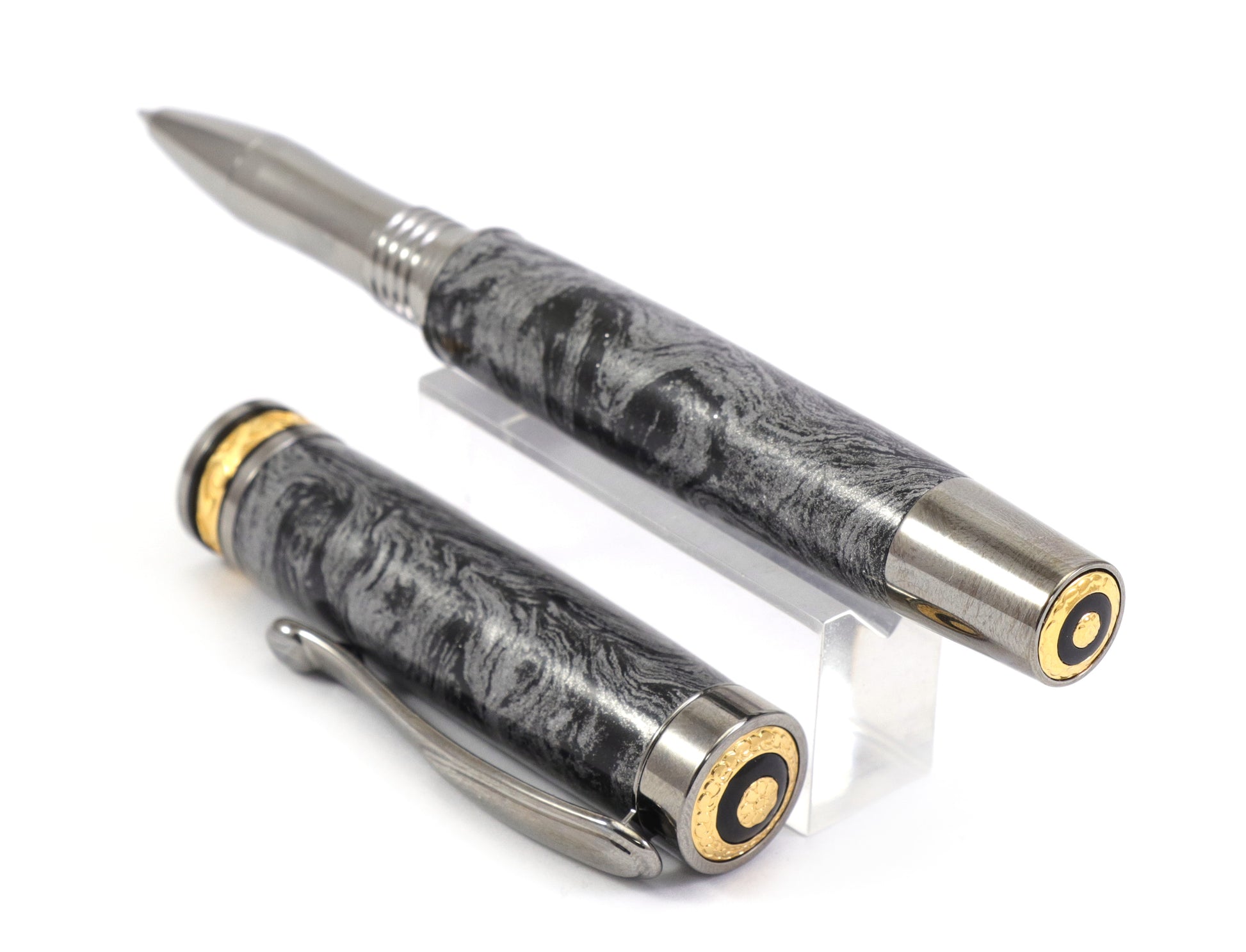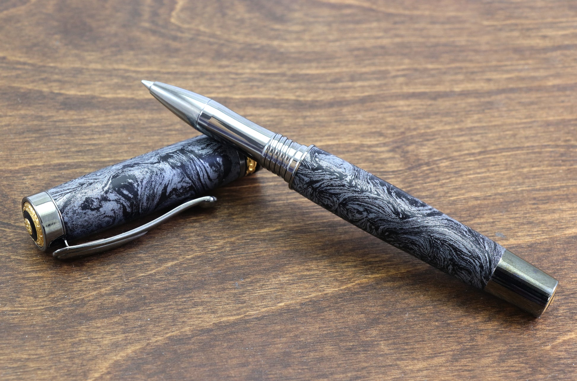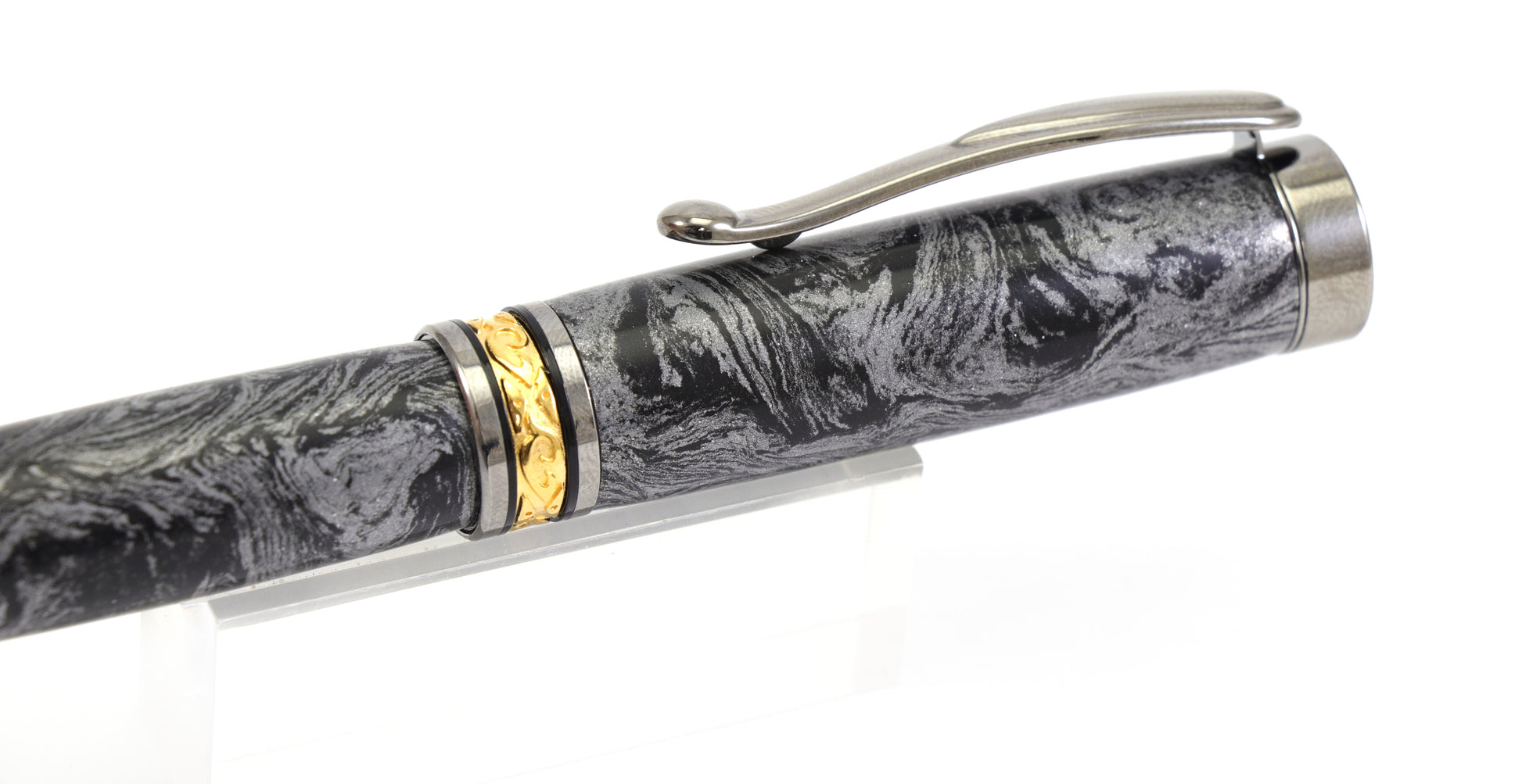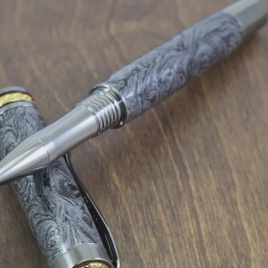 This is a one of a kind pen featuring a body made with a Grey & black swirl of metal dust in resin. The body has real depth and looks incredible.