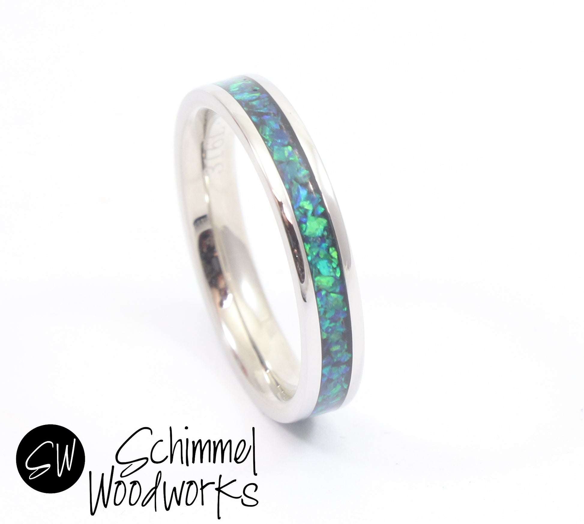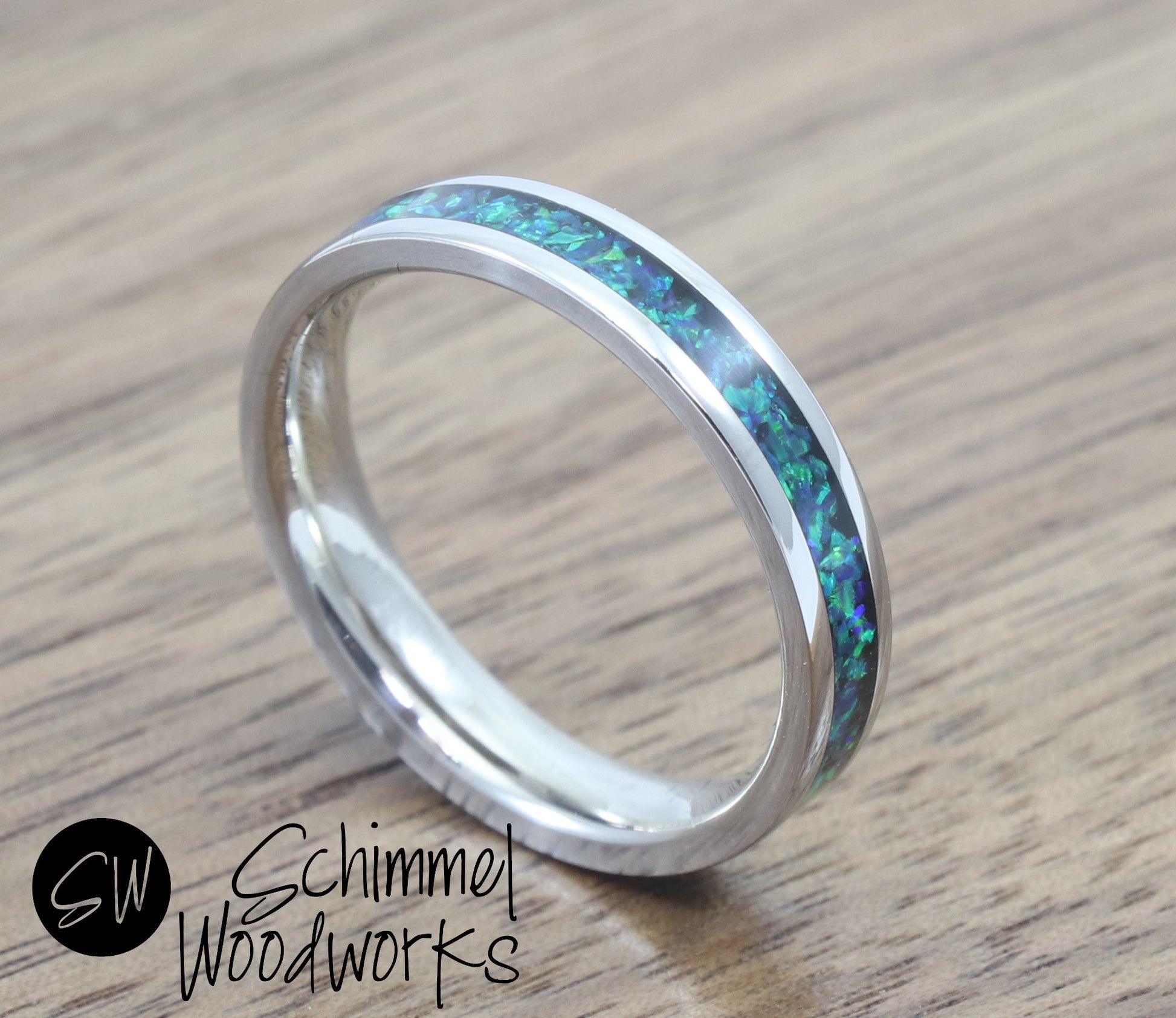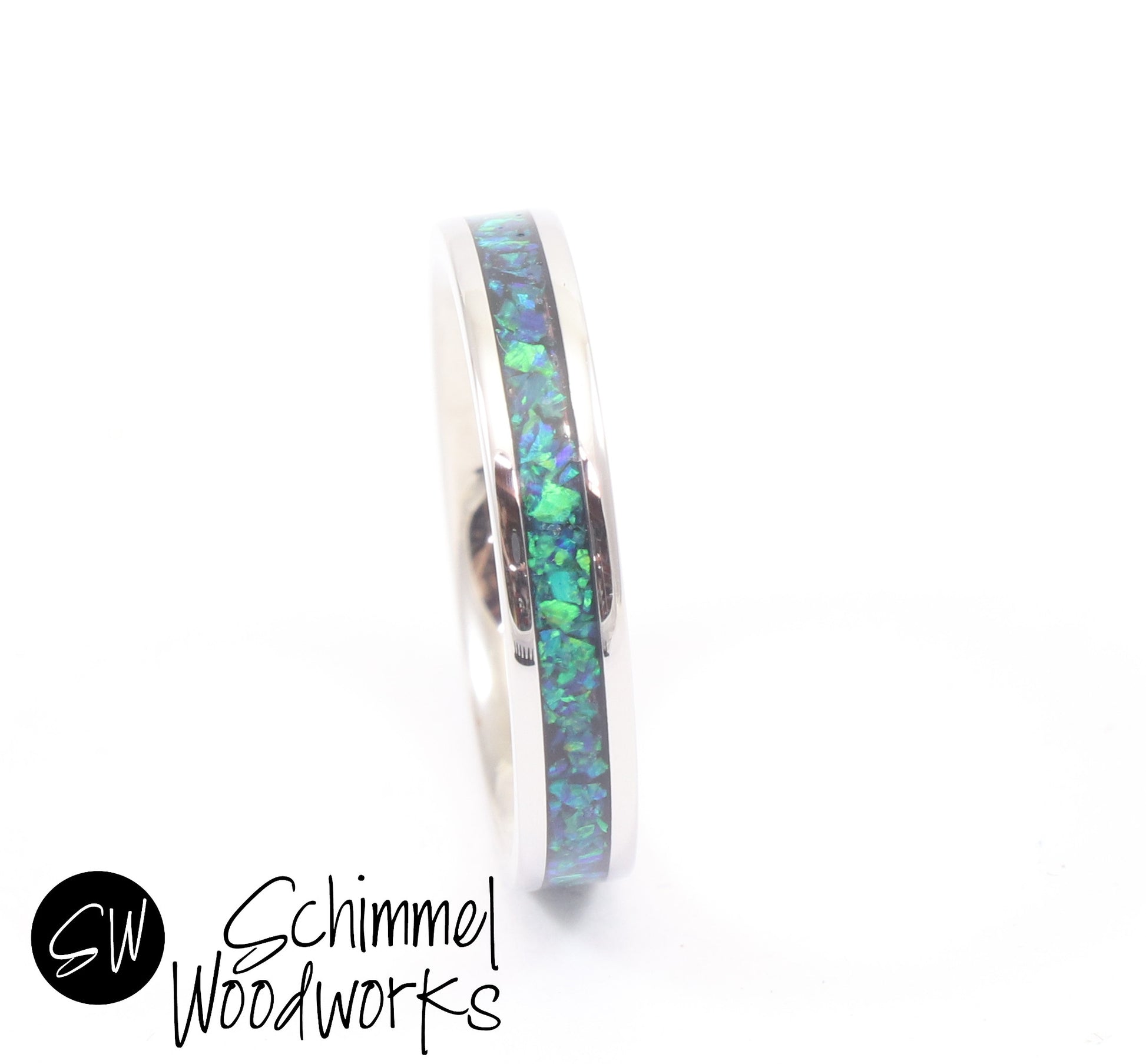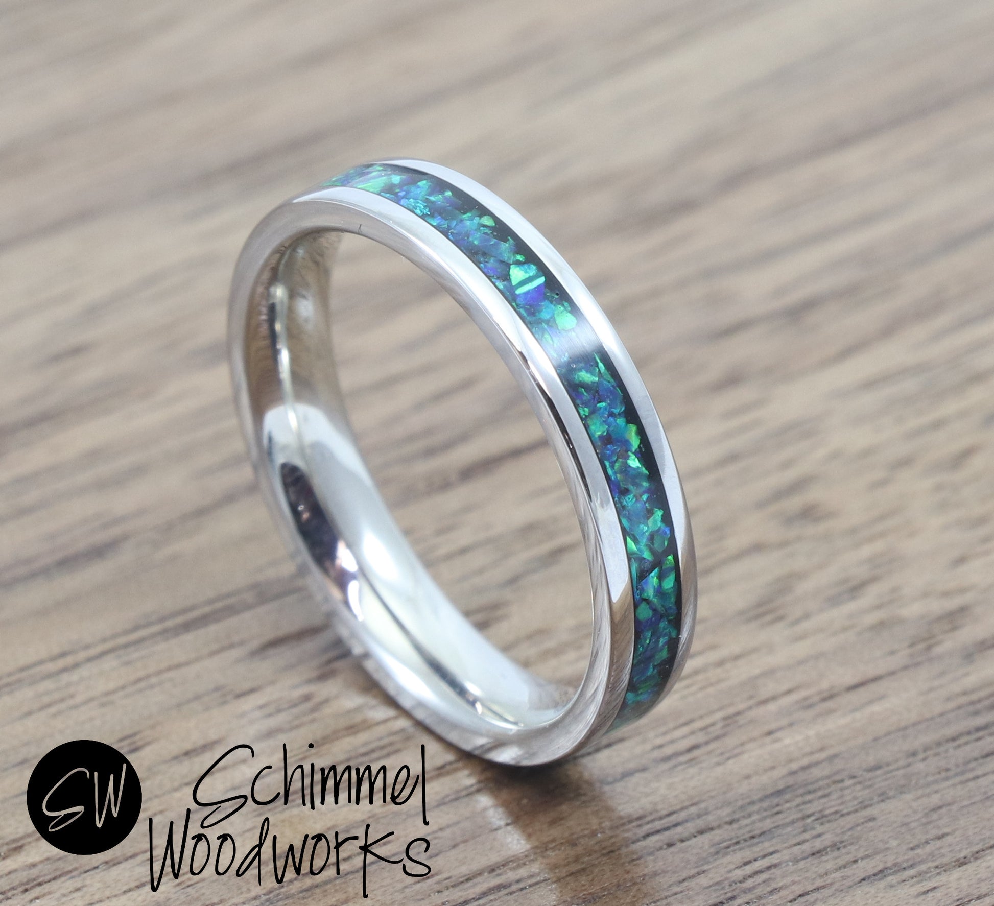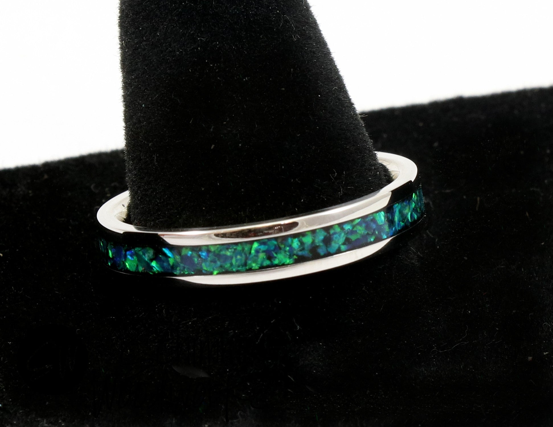 This ring is made in a process that takes several hours, cultured opal is hand placed inside ring channel and polished to give it shine.