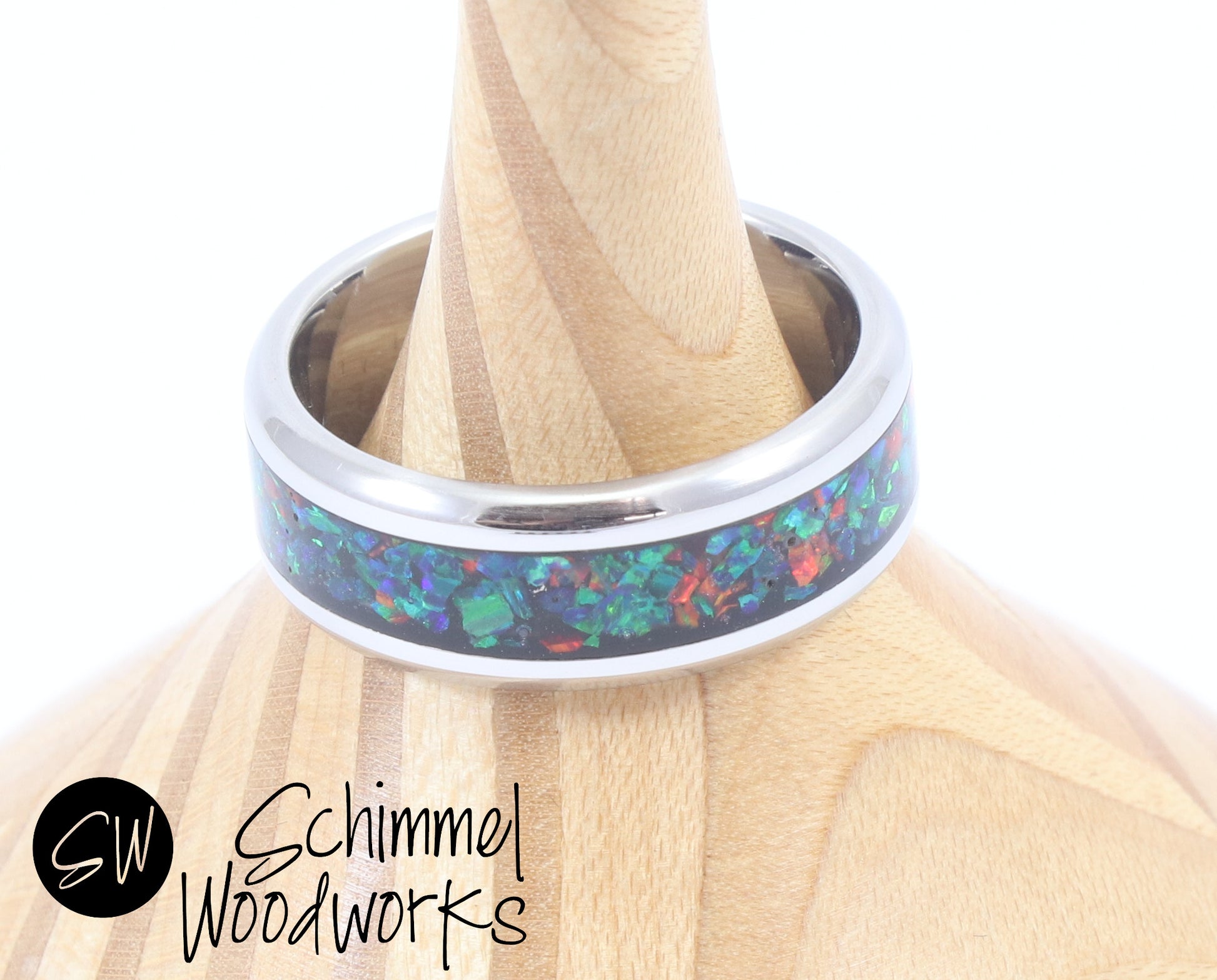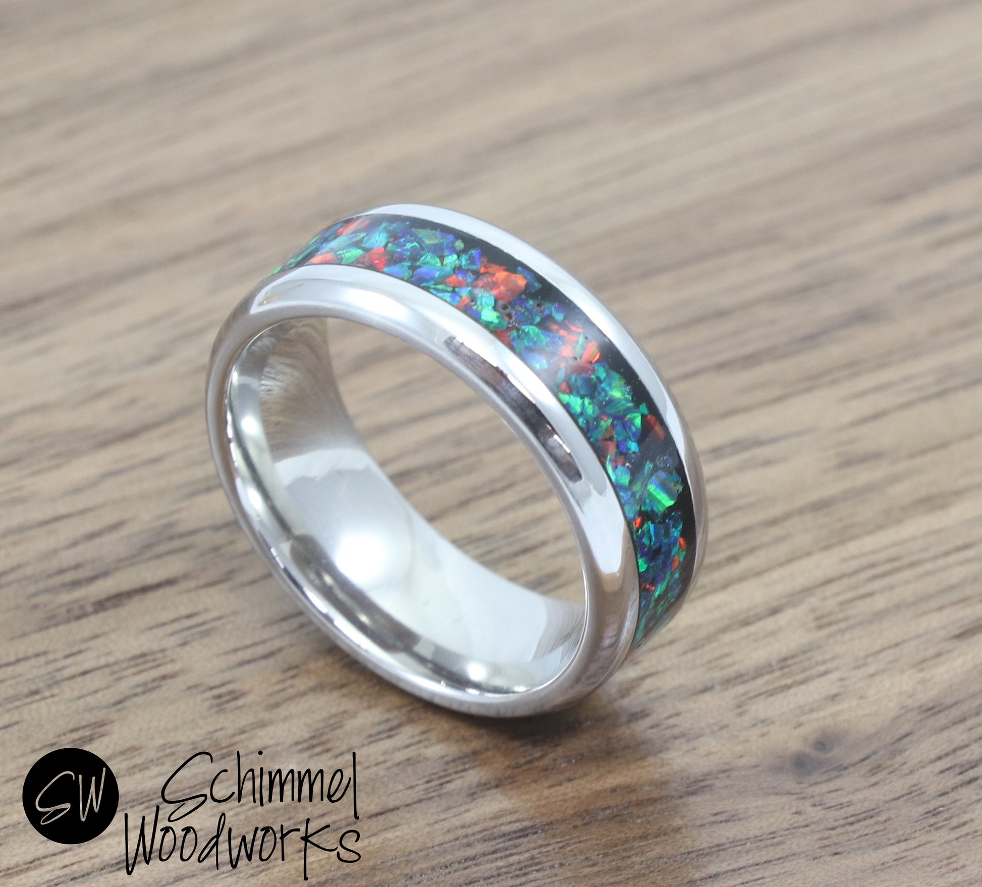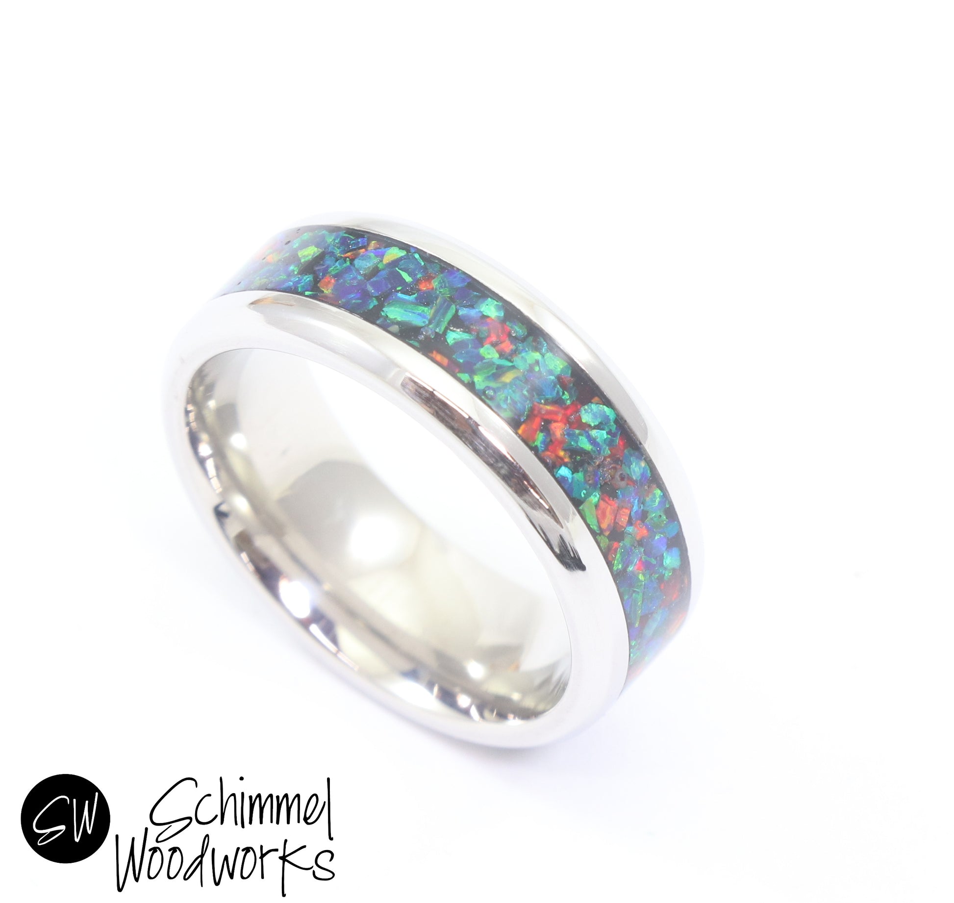 This ring is made in a process that takes several hours, cultured opal is hand placed inside ring channel and polished to give it shine.