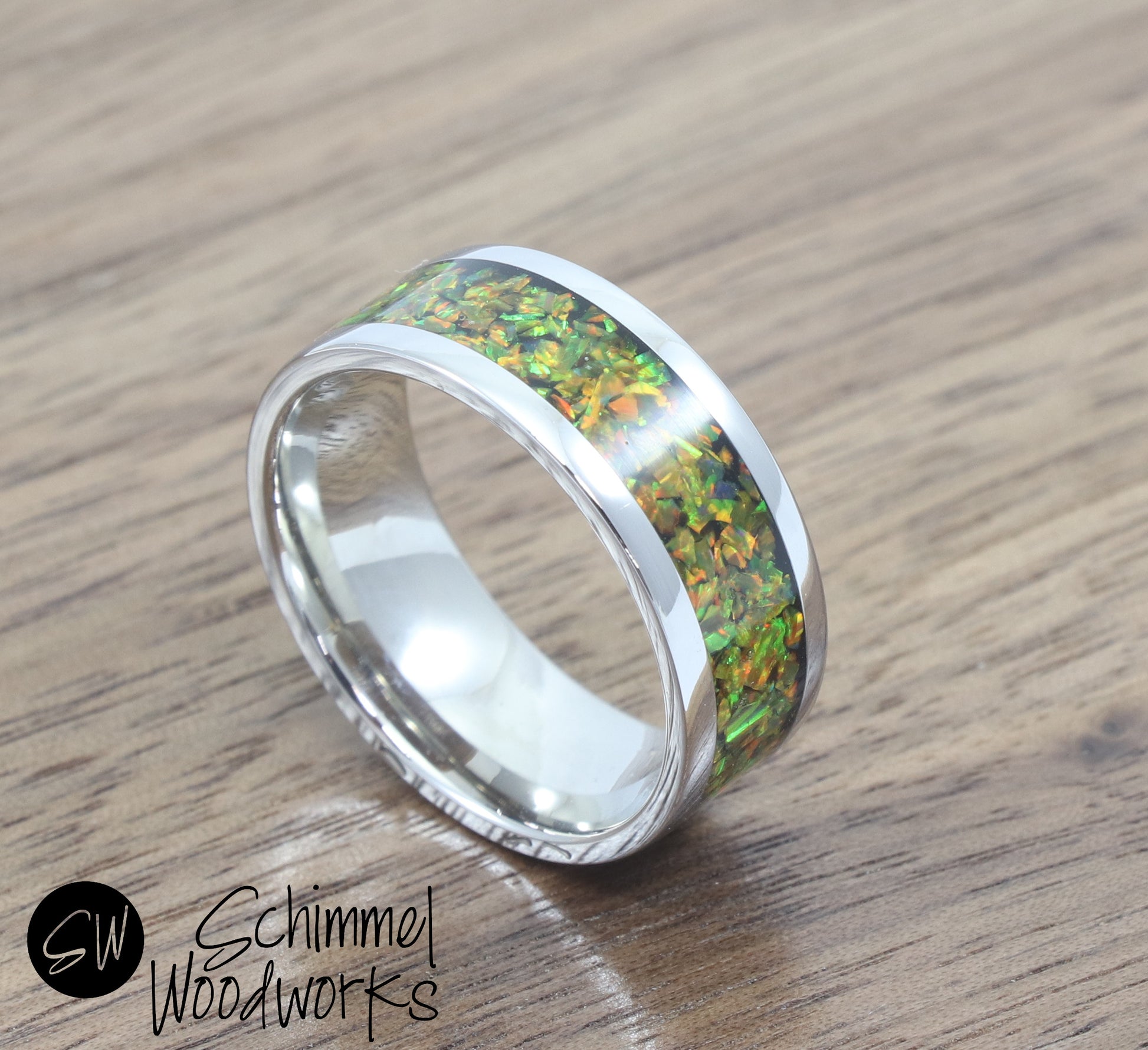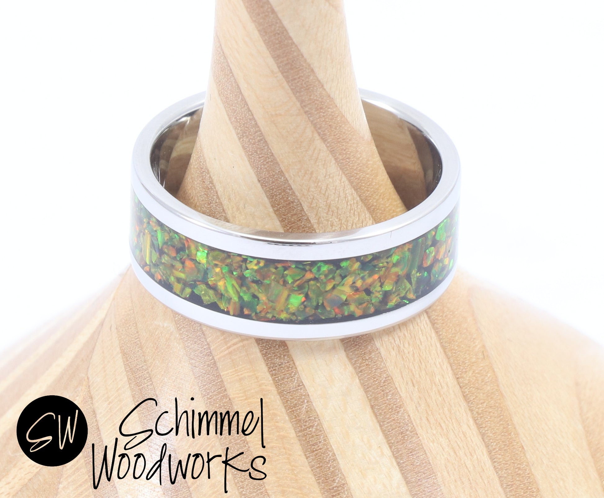 This ring is made in a process that takes several hours, cultured opal is hand placed inside ring channel and polished to give it shine.