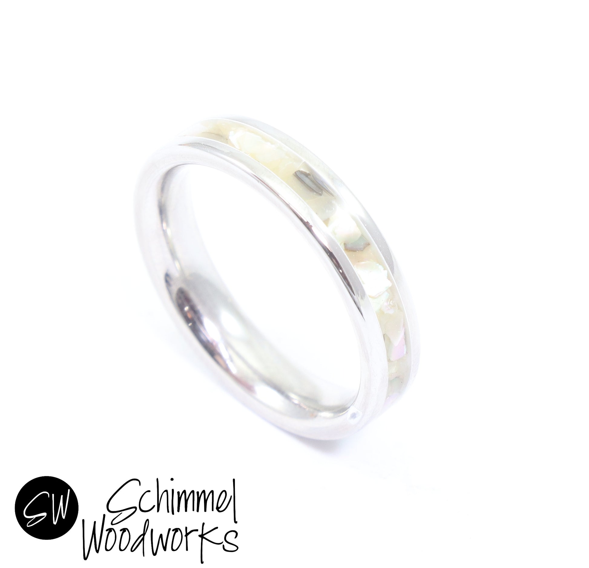 Stainless Steel channel ring with real Abalone Shell in crystal clear resin.
