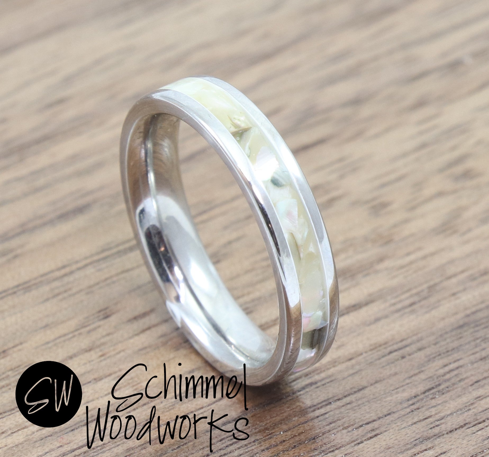 This ring is made in a process that takes several hours, Abalone Shell is hand placed inside ring channel and polished to give it shine.