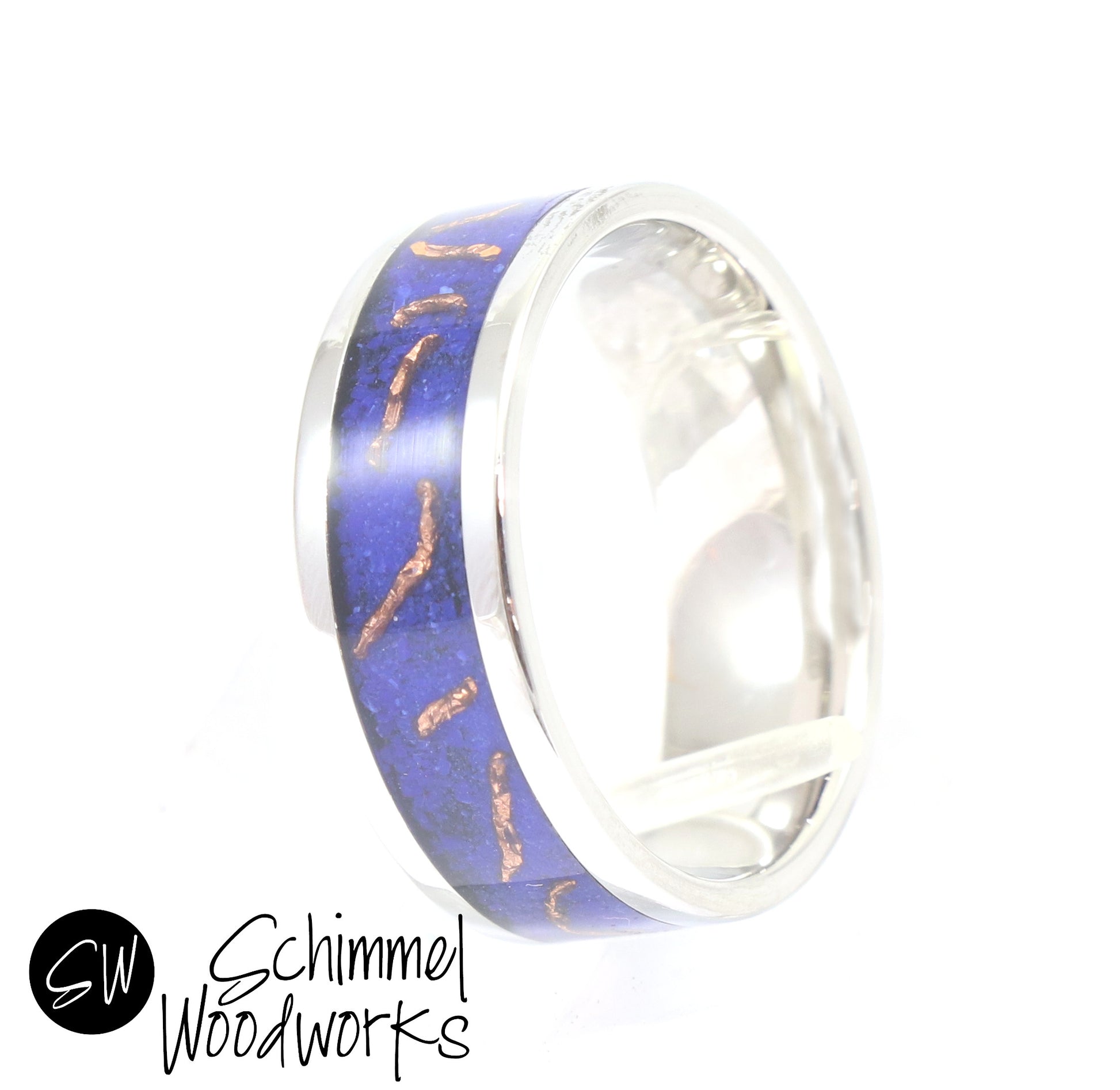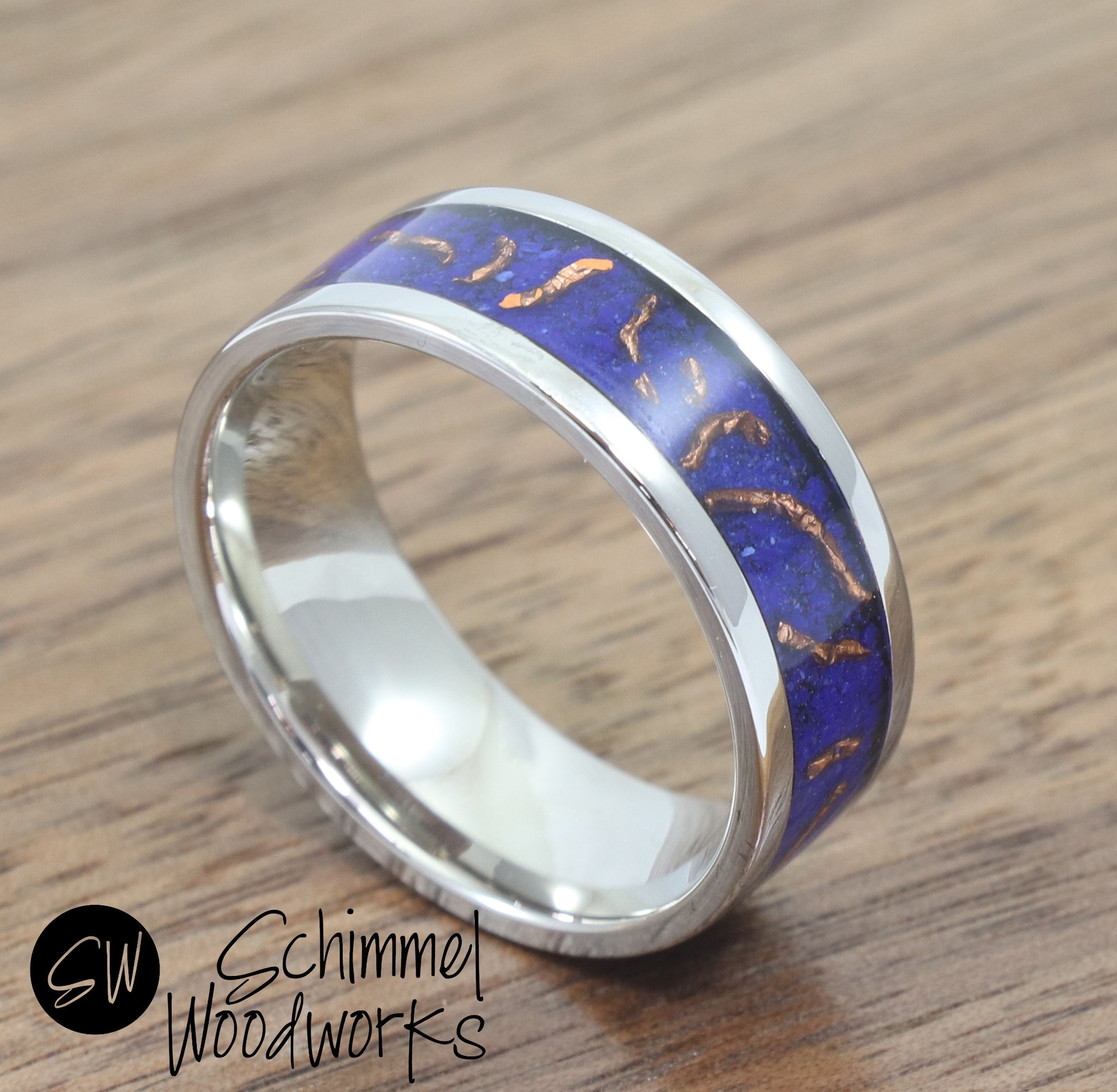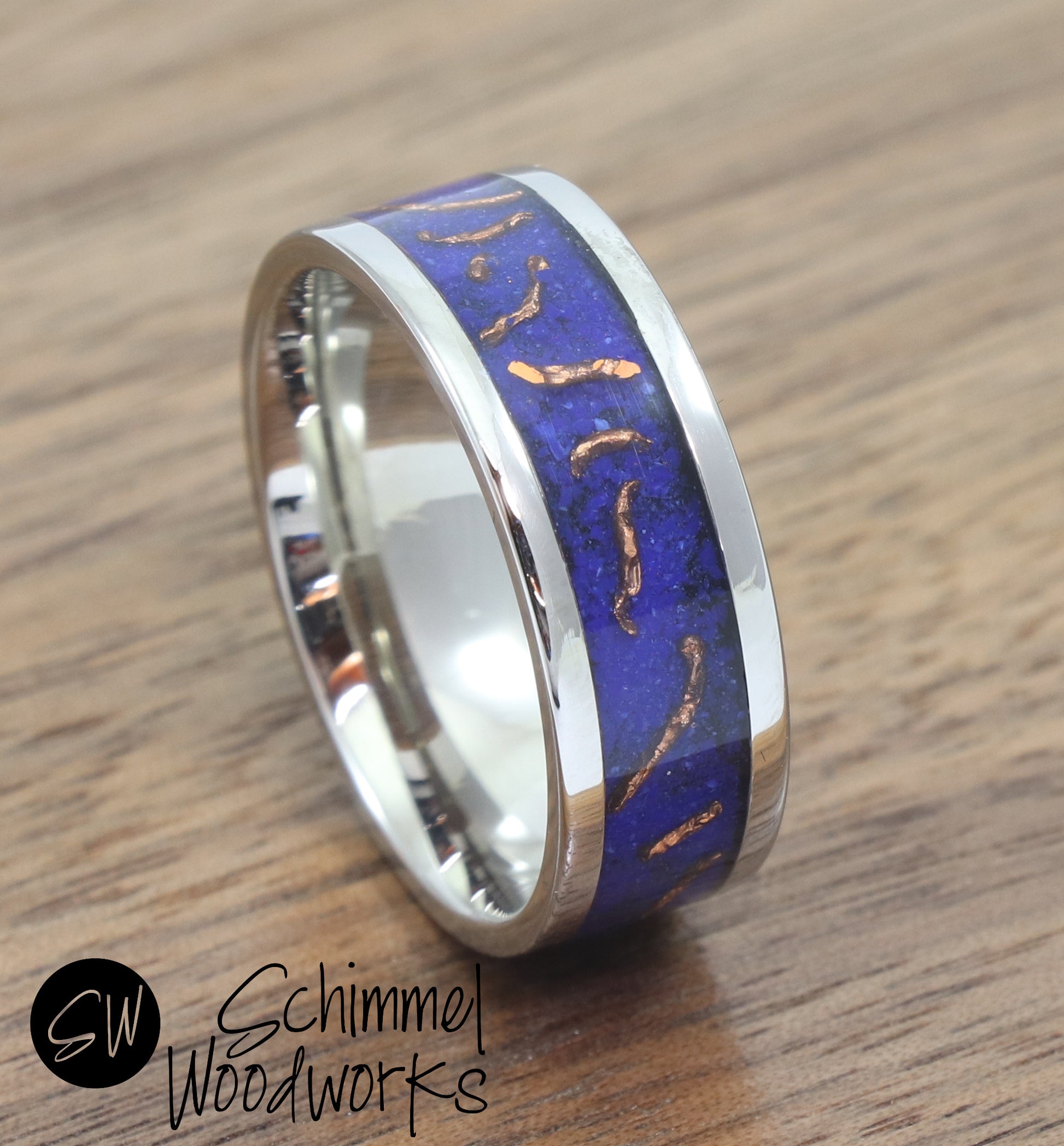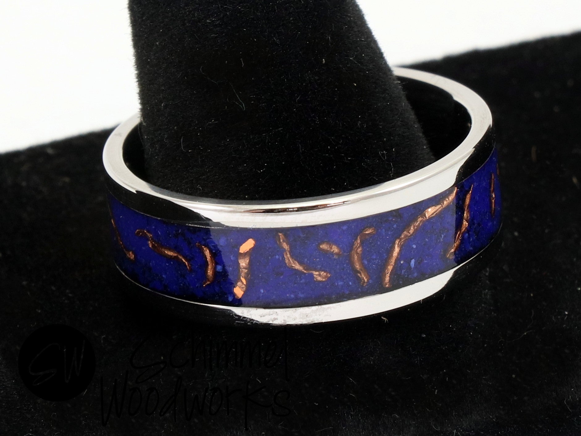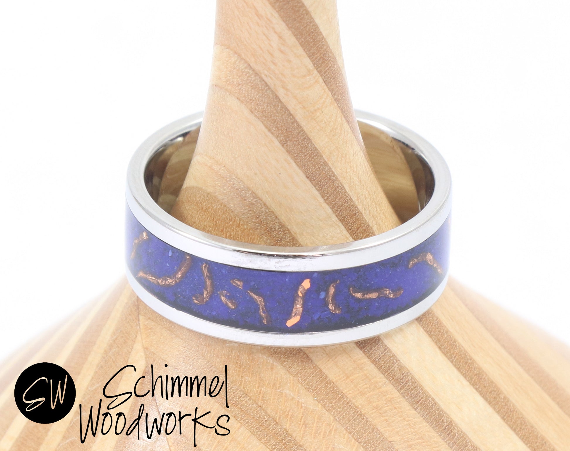 This ring is made in a process that takes several hours, copper is hand bent and hand cut, then hand placed inside ring channel on top of blue lab created stone and polished to give it shine.
