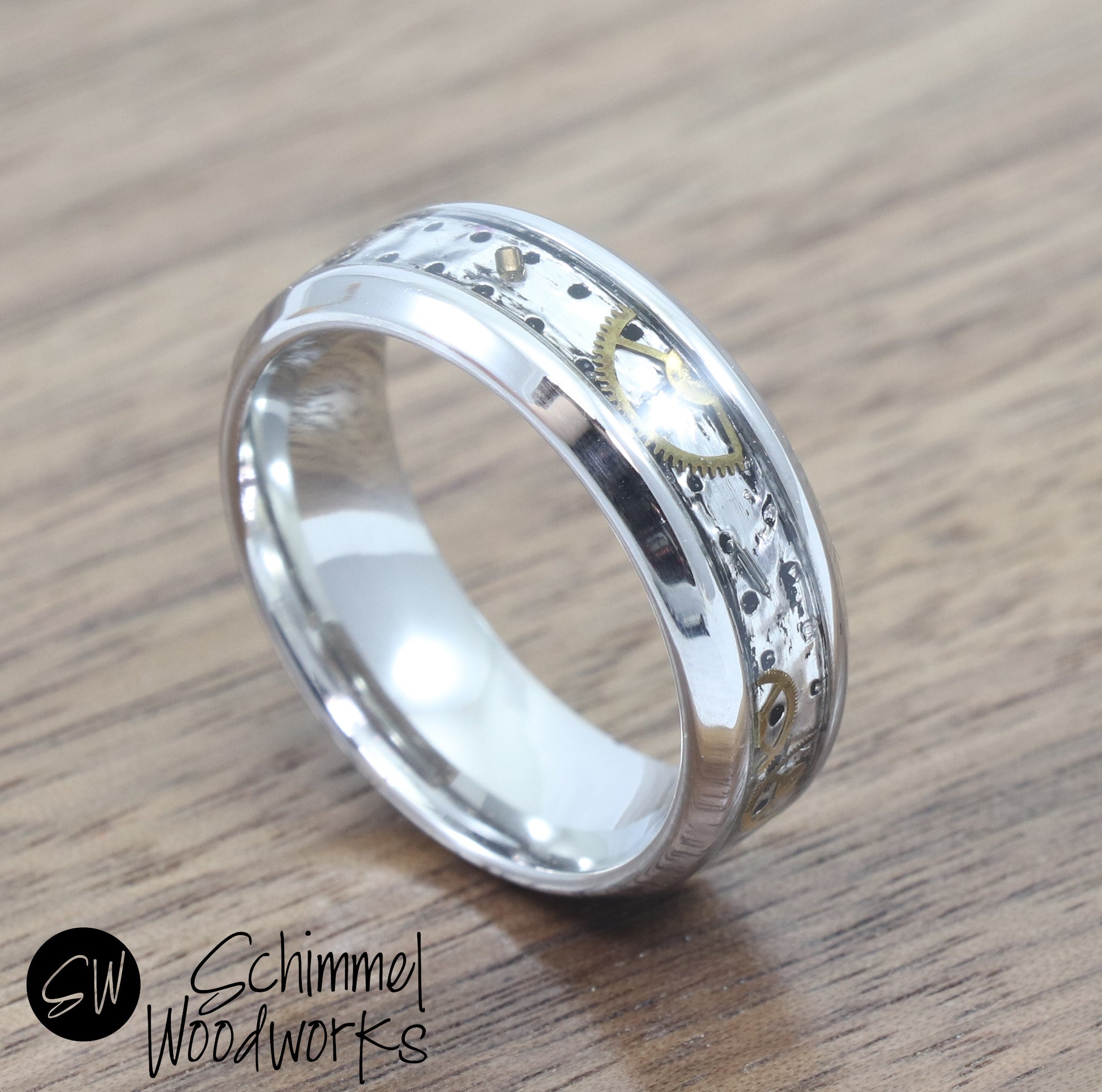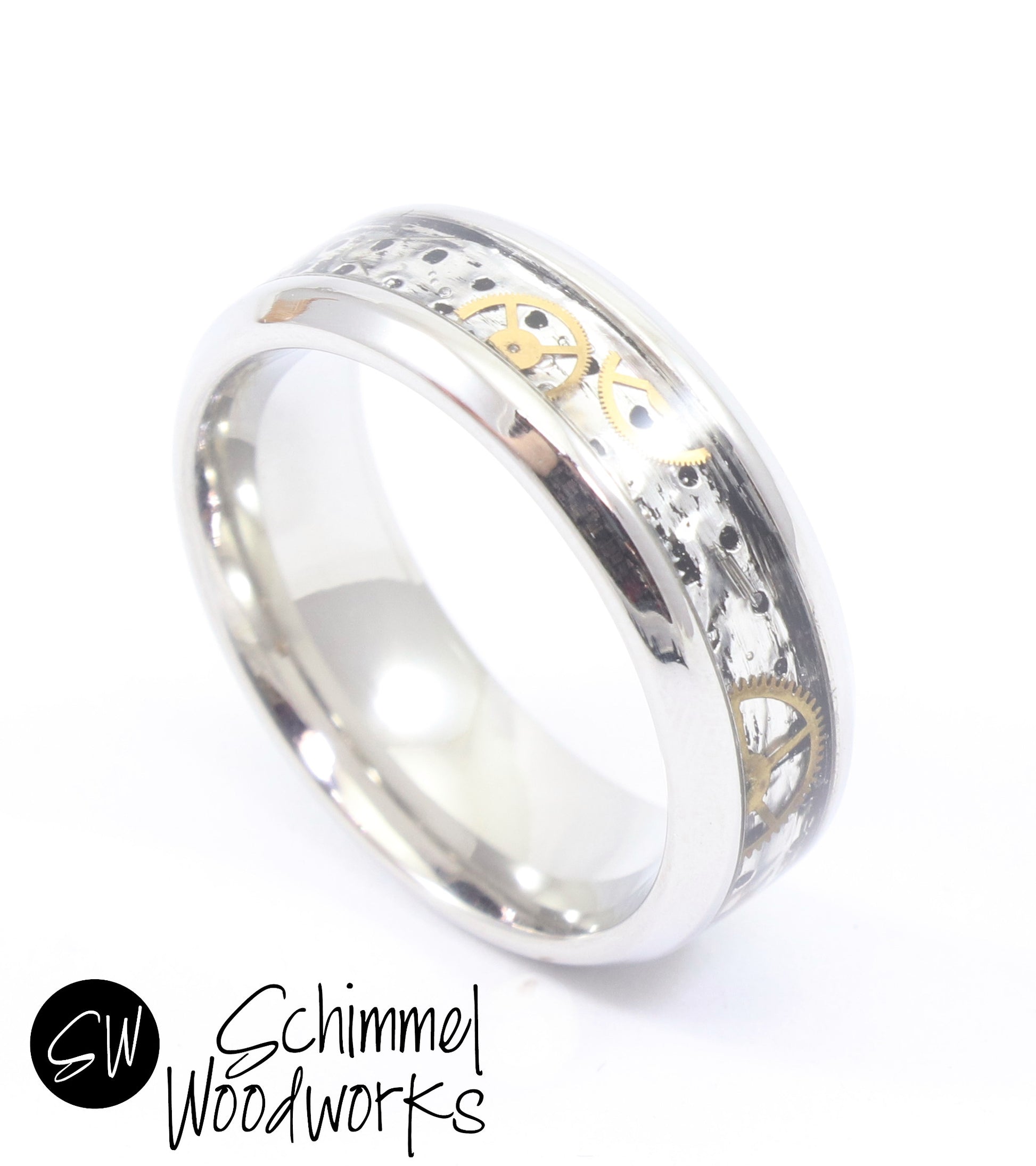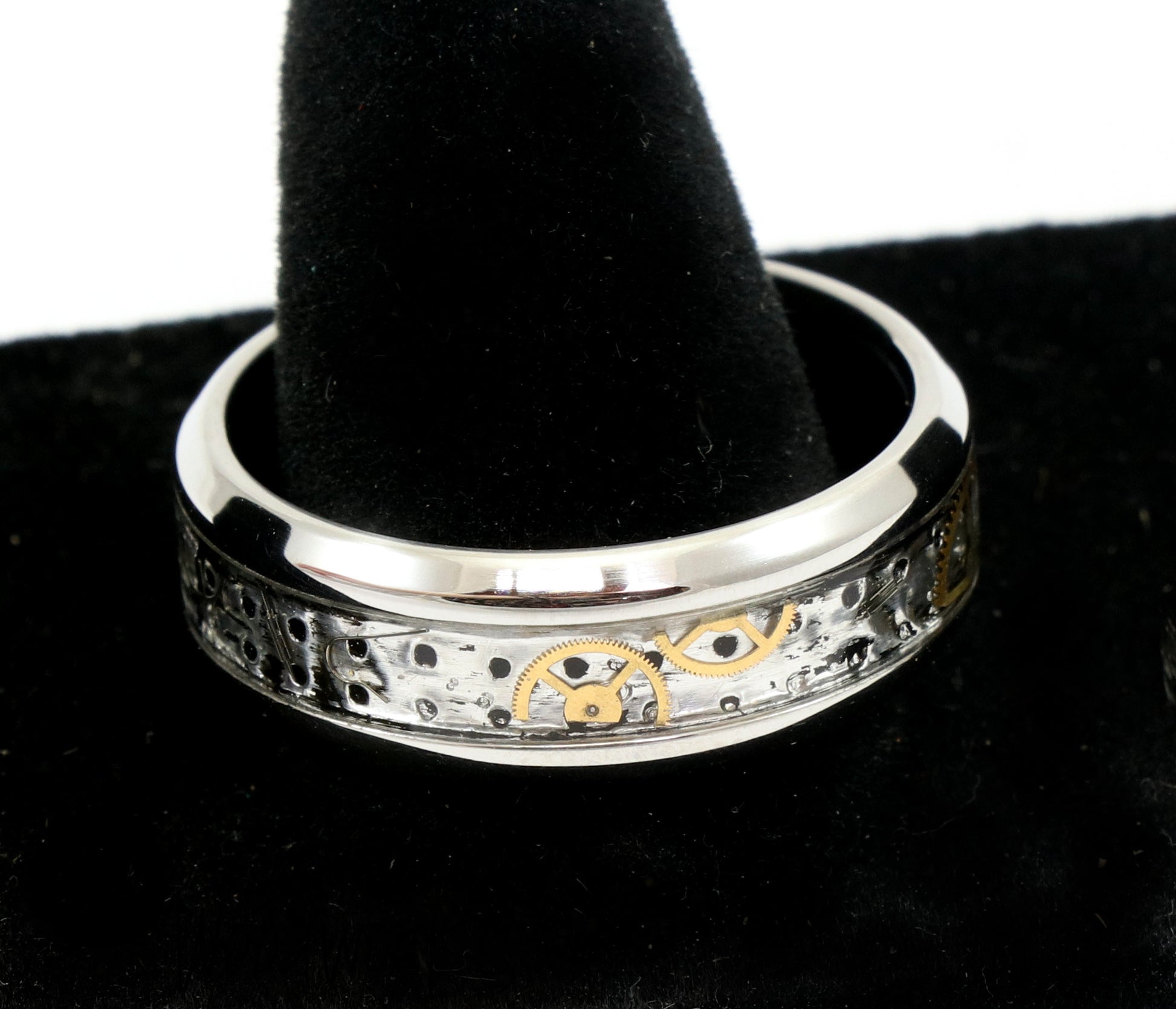 This ring is made in a process that takes several hours, watch gears are hand bent and hand cut, then hand placed inside ring channel and polished to give it shine. Cool industrial steampunk backing.