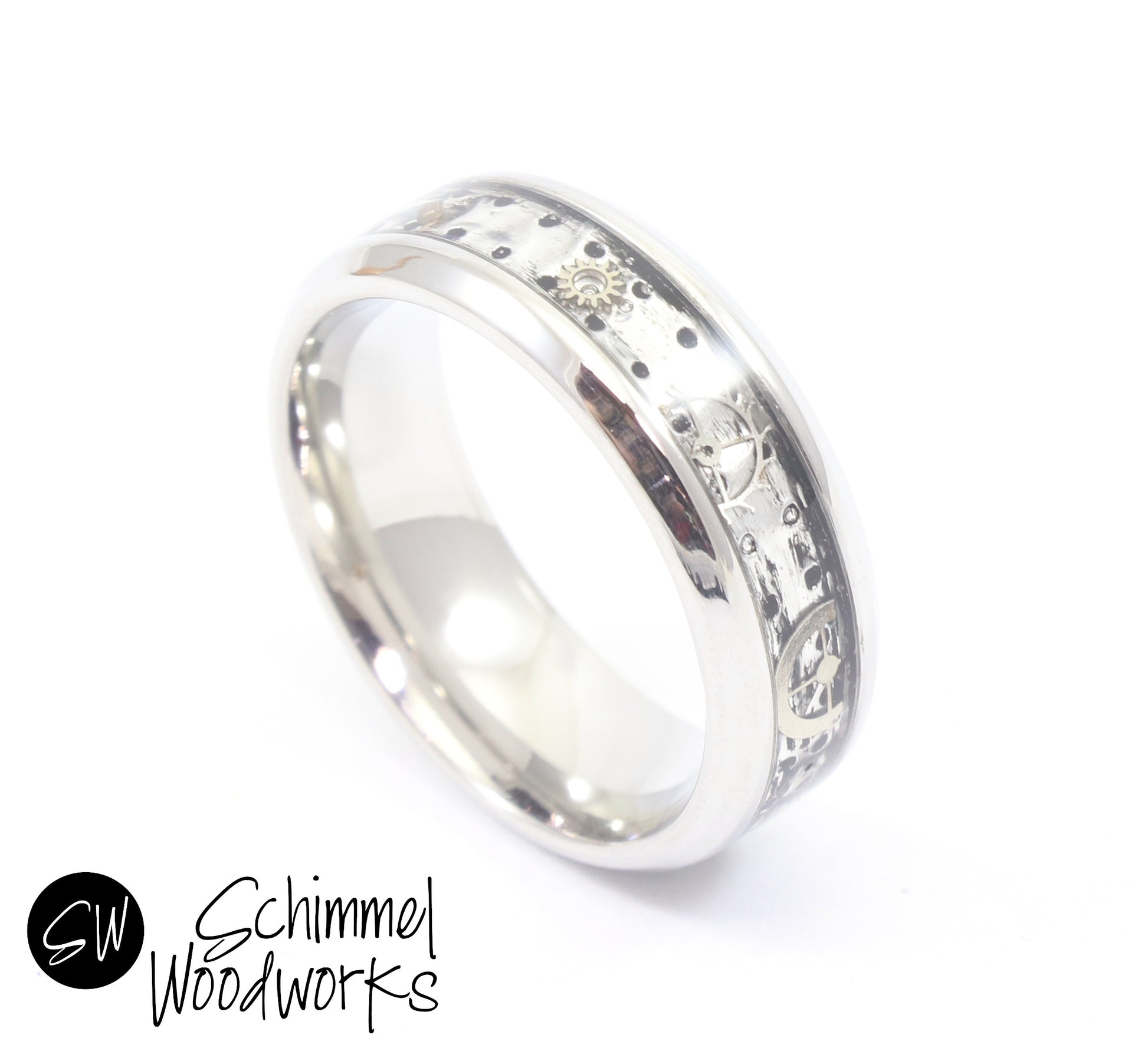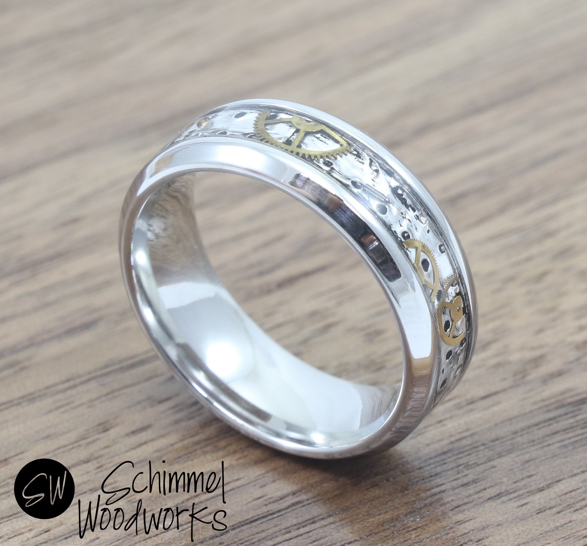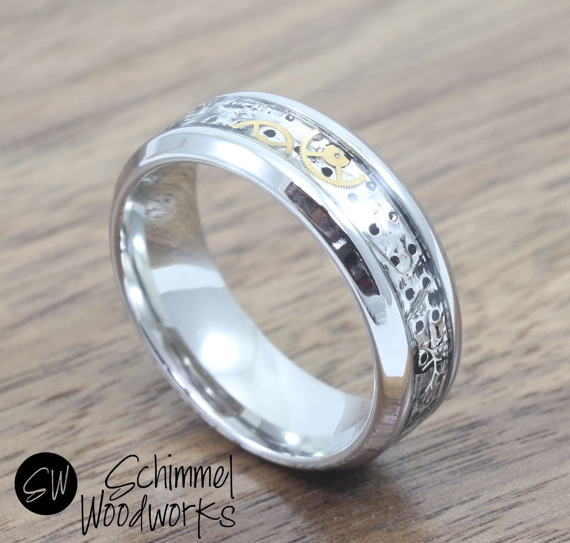 This ring is made in a process that takes several hours, watch gears are hand bent and hand cut, then hand placed inside ring channel and polished to give it shine. Cool industrial steampunk backing.