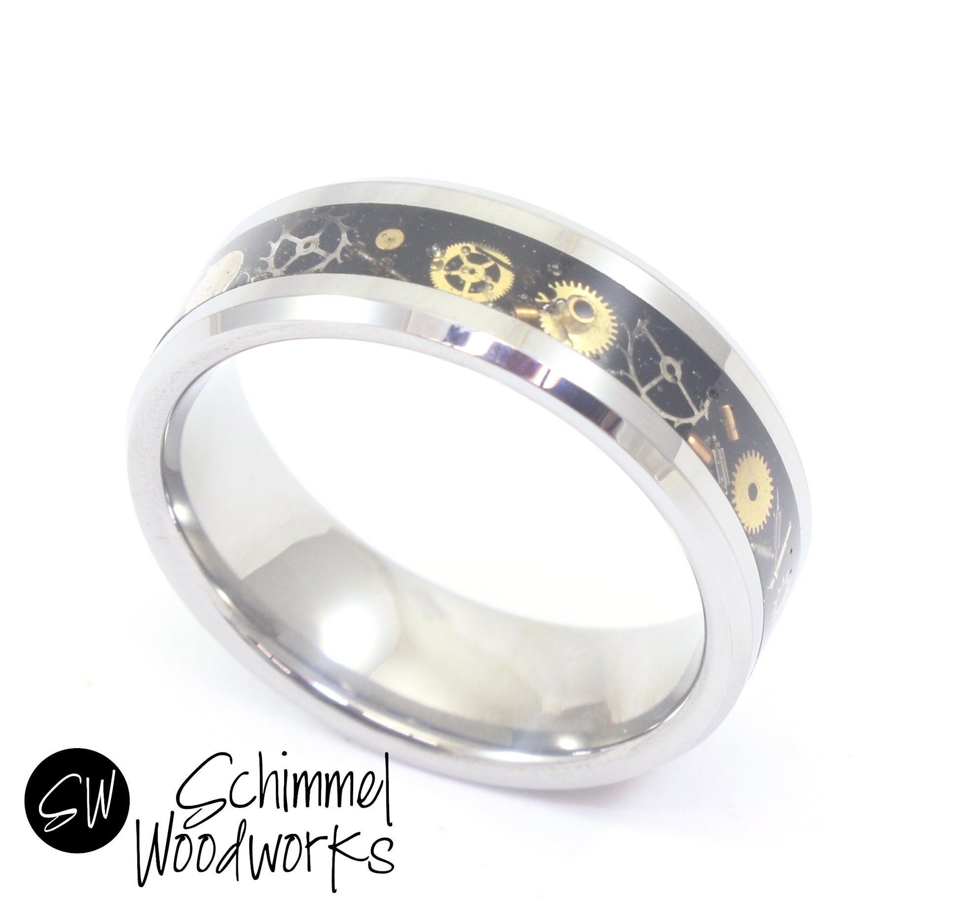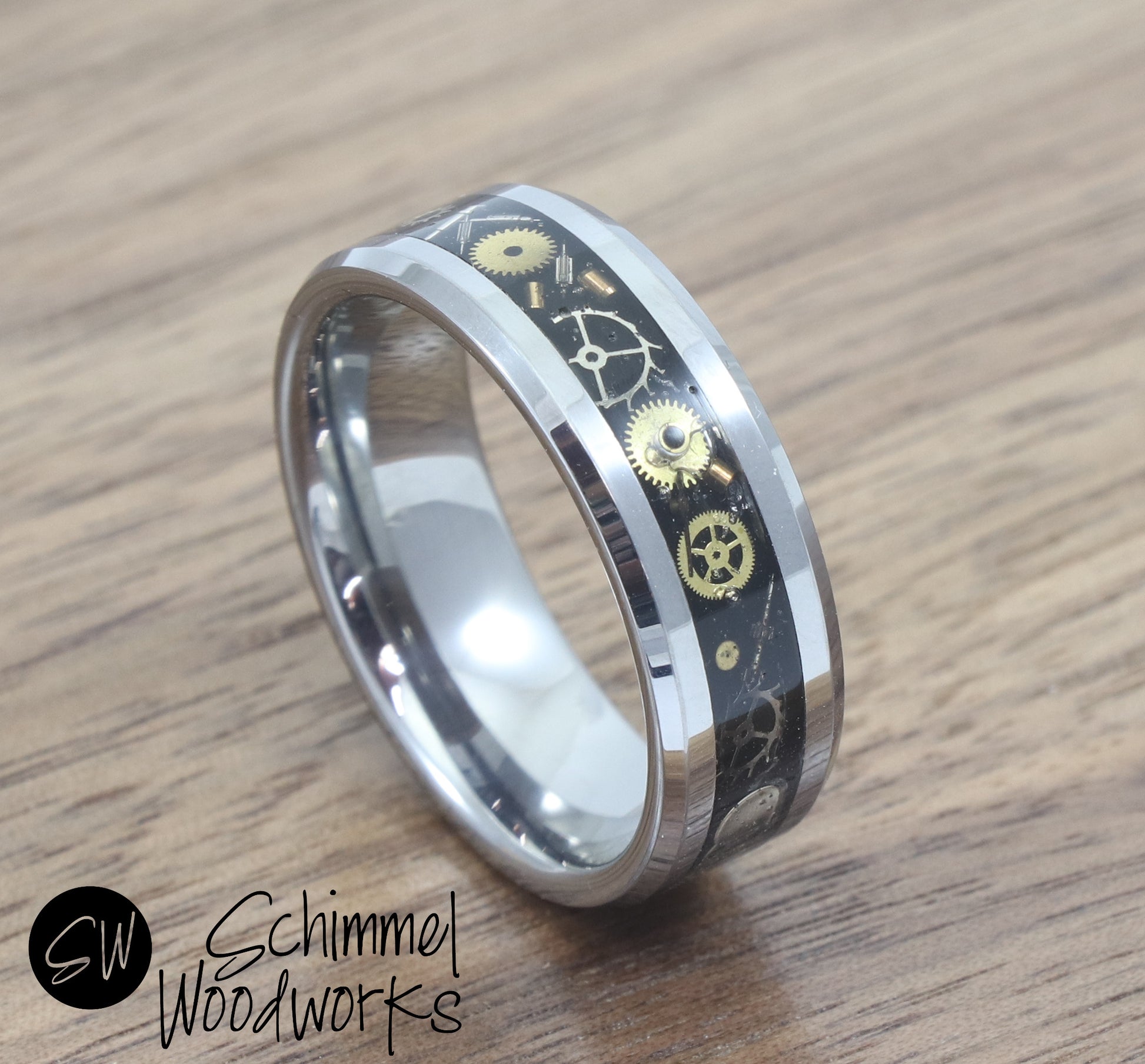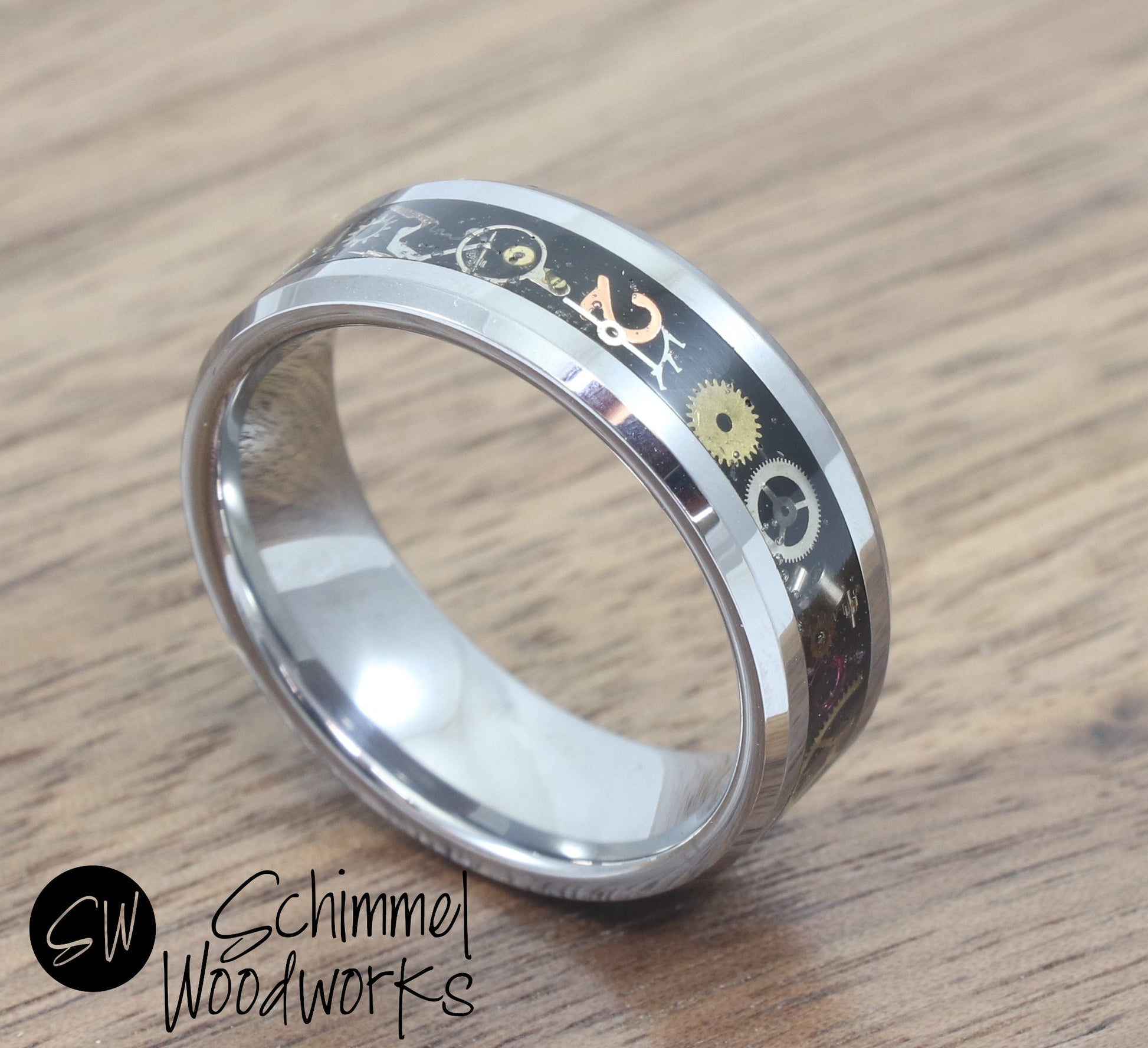 This ring is made in a process that takes several hours, watch gears are hand bent and hand cut, then hand placed inside ring channel and polished to give it shine. Cool industrial steampunk backing.